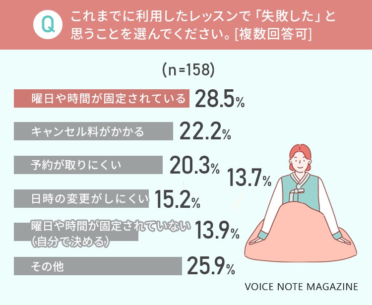 事前アンケートで韓国語を「以前、学んでいた」「現在、学んでいる」と回答した158名の方に、レッスンのスケジュールについて「失敗した」と思うことを聞きました。
