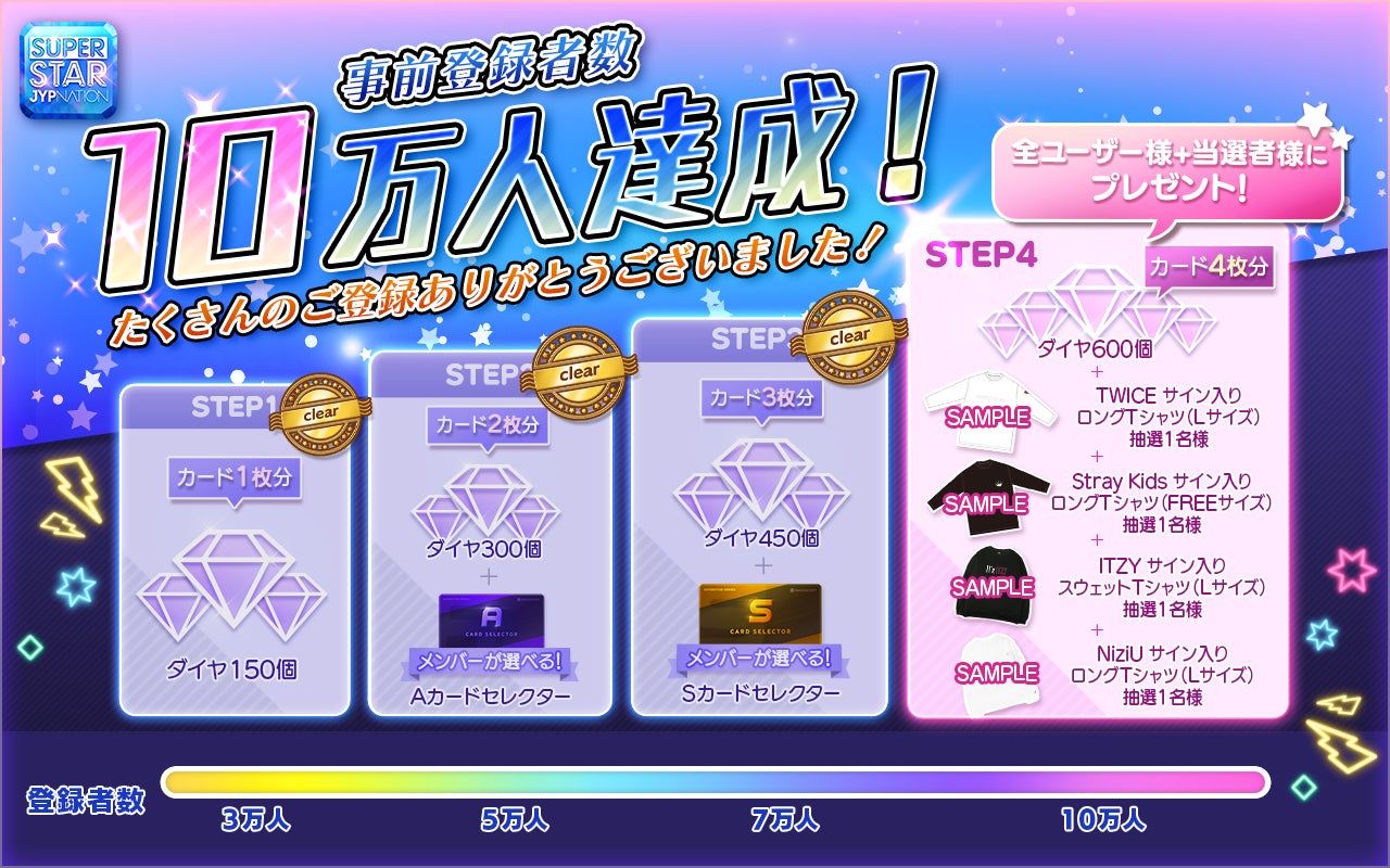 事前登録キャンペーンでは登録者数10万人を突破しており、ゲーム内でご利用いただけるダイヤ(1500個)と好きなアーティスト写真を選んでゲットできるAカードセレクター1枚、Sカードセレクター1枚を全ユーザー様にプレゼントいたします。さらにTWICE、Stray Kids、ITZY、NiziUの各グループメンバー全員のサイン入りグッズを抽選で4名様にプレゼントいたします。