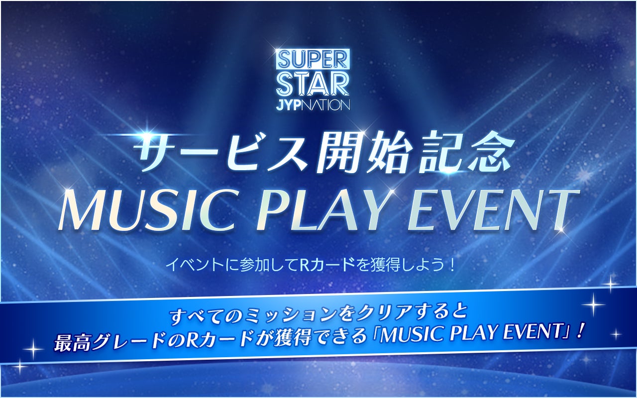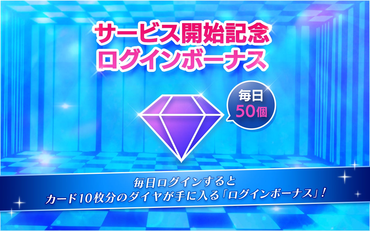 サービス開始を記念して、毎日ログインするとカード10枚分のダイヤが手に入る「ログインボーナス」と、すべてのミッションをクリアすると最高グレードのRカードが獲得できる「MUSIC PLAY EVENT」を開催しております。是非、この機会にお楽しみください。