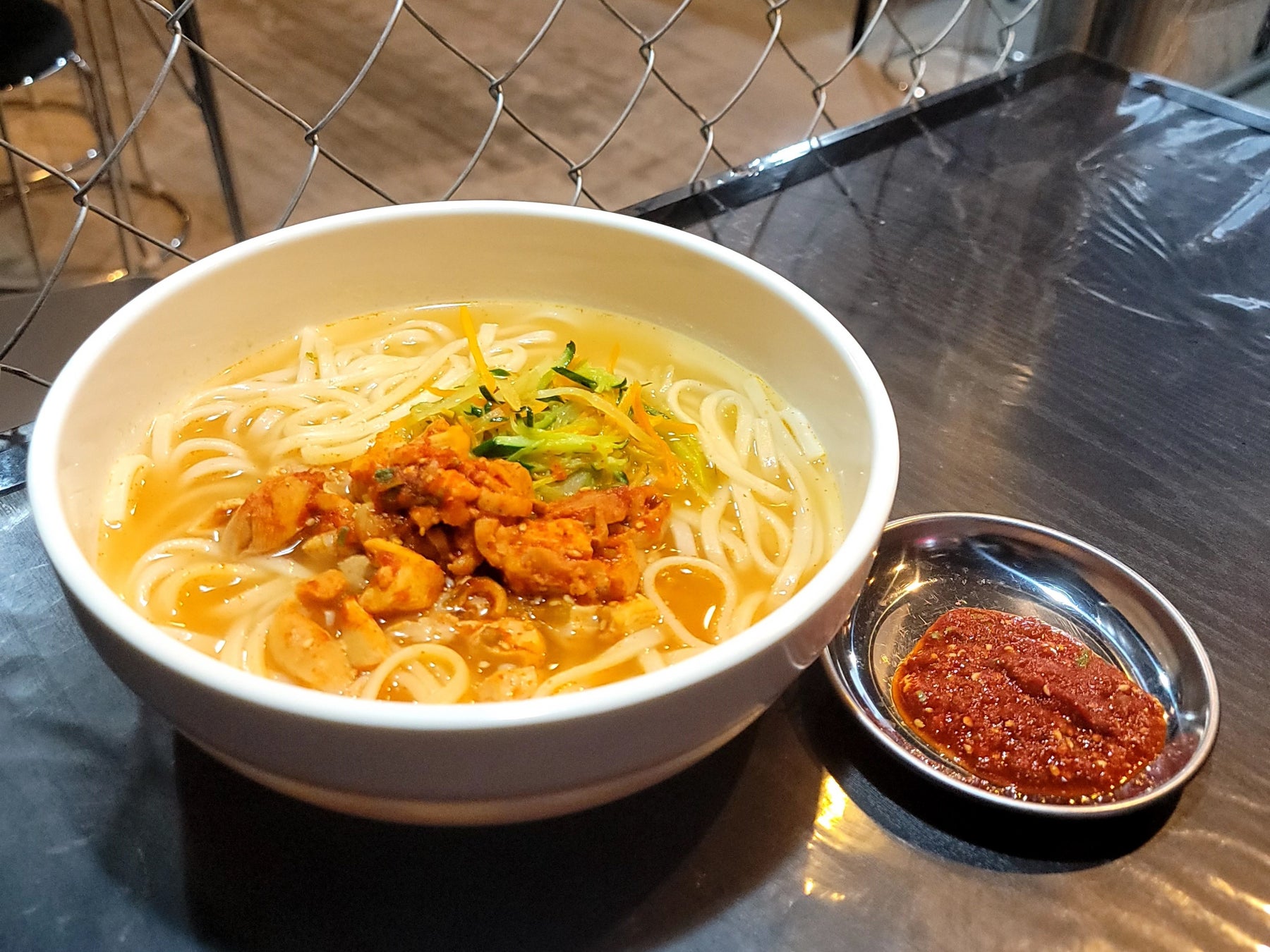 温かい麺料理のカルグクスは、お酒の締めにもぴったりの一品です。あっさりとした鶏ベースの出汁とモチモチの平麺が優しい味わいとなっております。トッピングの鶏肉は味を引き立たせ、小皿の薬味でお好みの辛さに調整できます。