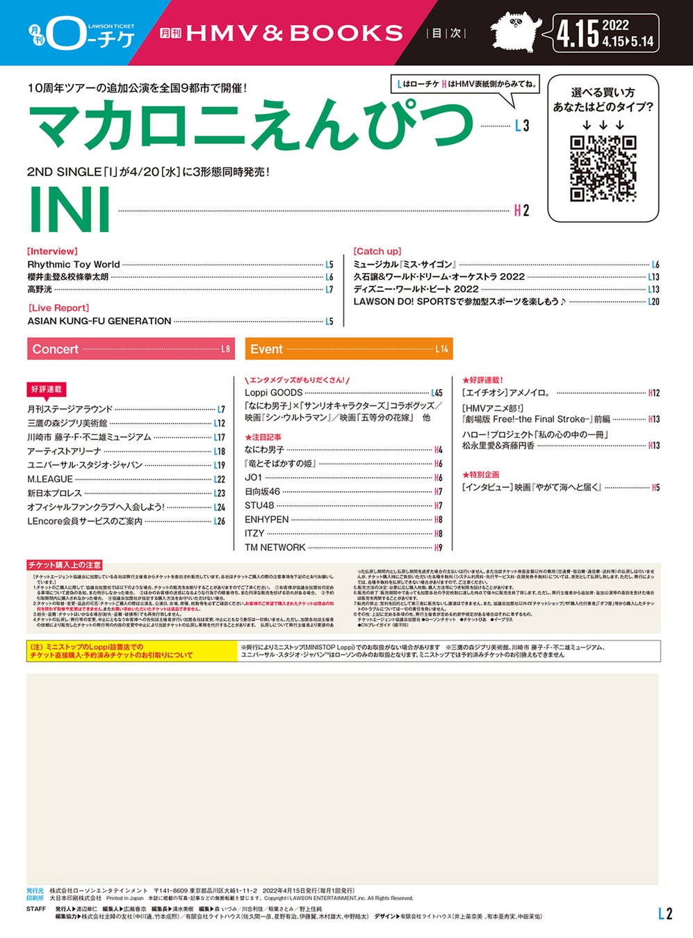 月刊ローチケの表紙は、メジャー1stアルバムを携えた全国ツアーの追加公演を全国9都市で開催する「マカロニえんぴつ」。そして、月刊HMV&BOOKSの表紙には、4月20日(水)に2ND SINGLE『I』を3形態同時リリースする「INI」が登場!そのほか、本誌だけでしか見られないインタビューや連載も必見です。