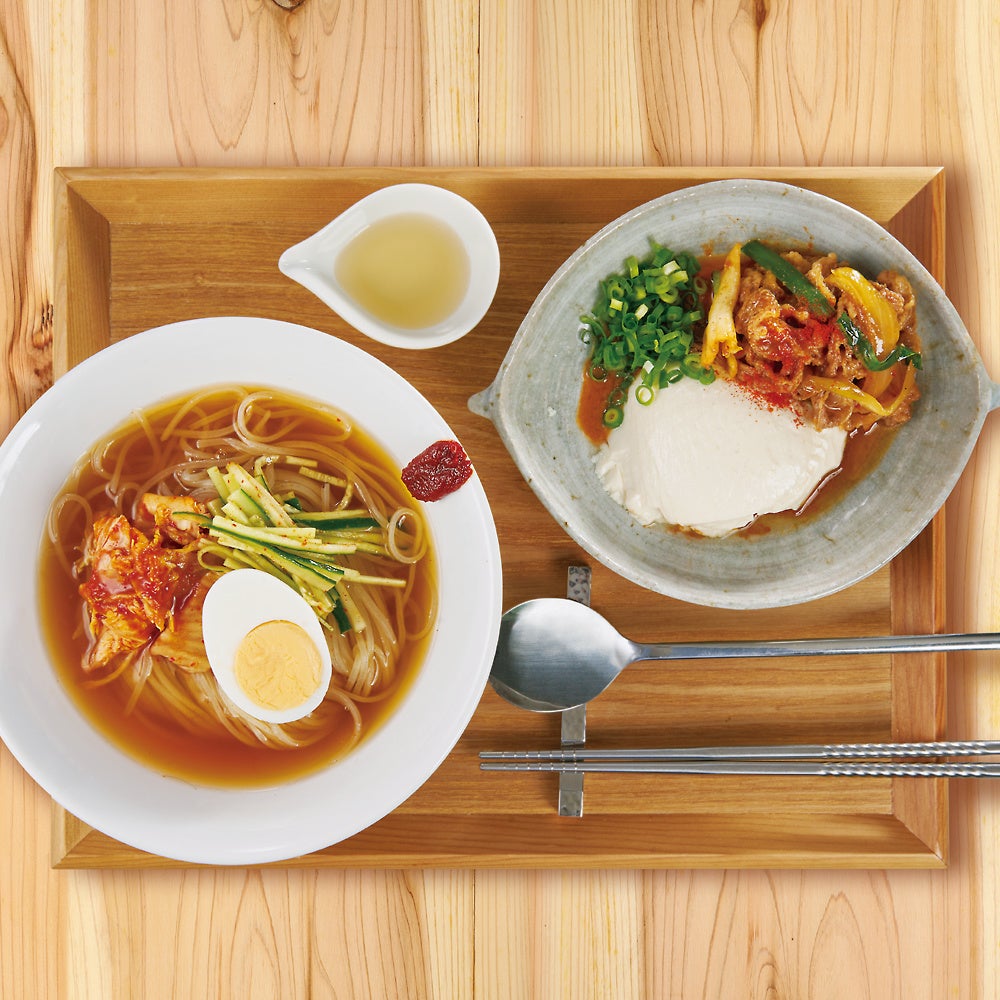 冷麺は、シンプルな単品に加え国産大豆「トヨマサリ」を使用した自家製豆腐と甘辛く仕上げたお肉で食べごたえのある肉豆腐とセットやスンドゥブとご一緒にボリュームたっぷりな楽しみ方もご用意しております。