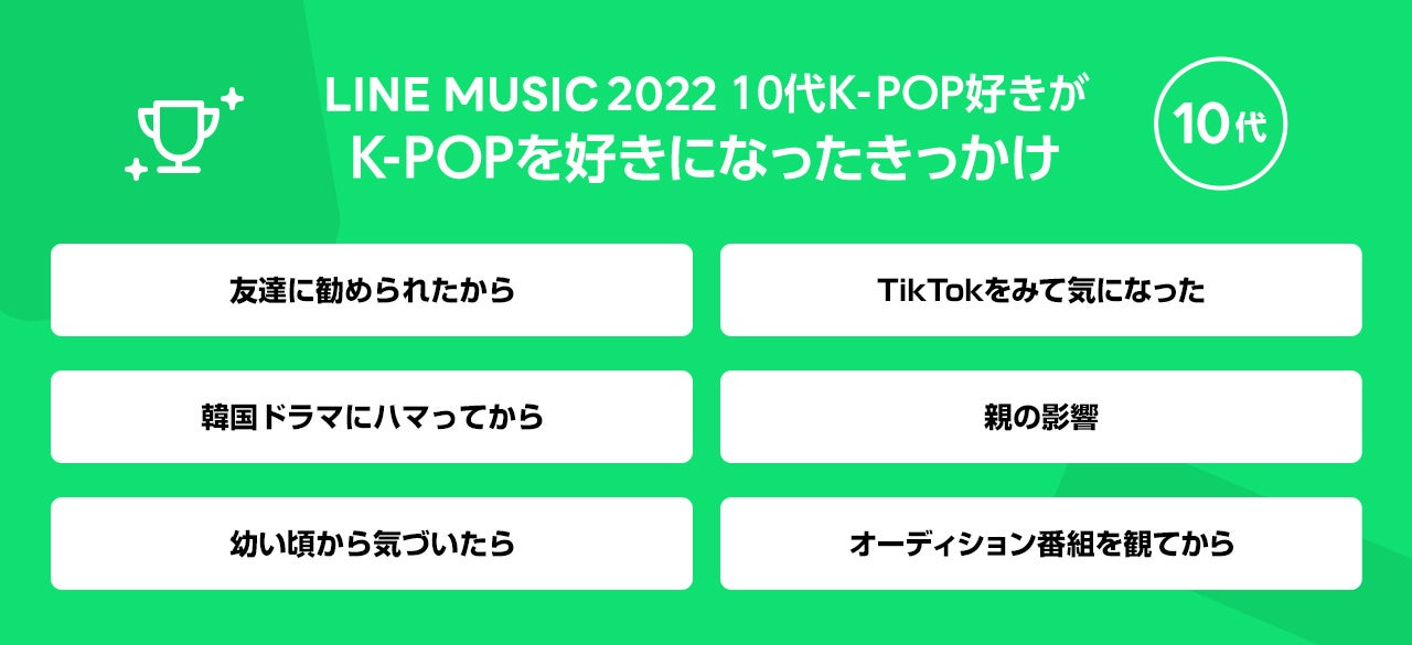 K-POPを好きになったきっかけは、「友達に勧められたから」と言った声が多く上がったほか、「TikTok」や「オーディション番組」を観て気になったという最近K-POPが好きになったという声と、「幼い頃から気づいたら好きだった」「親の影響」や「親・と一緒にハマっている」など親子でK-POPを楽しむ声も寄せられました。