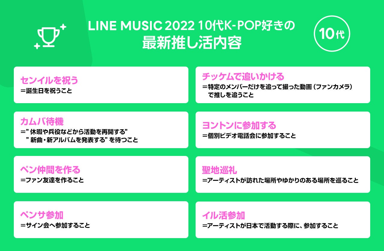 日本のファン・推し活動と比べ、また違った文化を持つK-POPですが、10代の中でもファン・推し活動は浸透しているコメントが寄せられました。推しのアーティストのセンイル(誕生日)を祝う活動としては「限定イベントをしているカフェに行った」「誕生日ケーキを作った・買った」「イラストや写真をコラージュしてSNSに投稿」したといったコメントのほか、「ペンサ」「ヨントン」「チッケム」など韓国語を元としたファンイベントの文化も浸透しているようです。