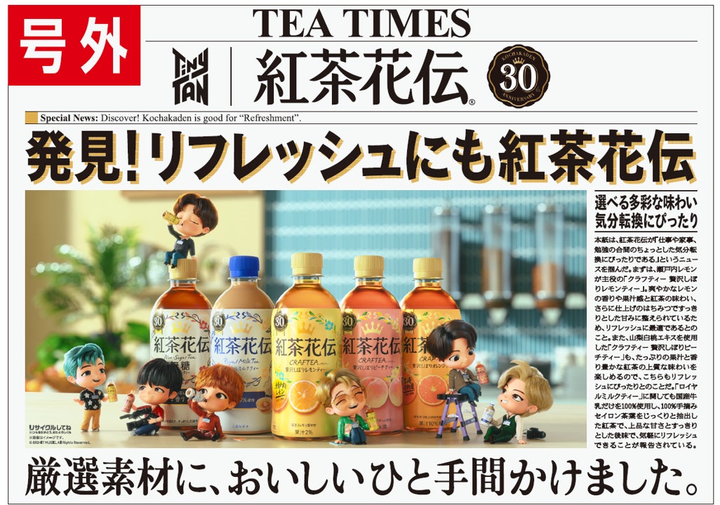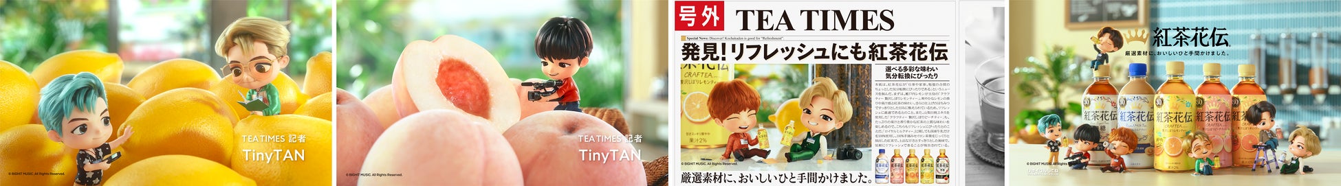 本キャンペーンでは、世界的人気を誇る「BTS」のキャラクター「TinyTAN」とコラボレーションし、架空の紅茶専門紙「TEA TIMES」の記者として「紅茶花伝」の素材や製法へのこだわりを解明し、発信していきます。新TVCMの全国放映やTwitterキャンペーン、また「紅茶花伝」オリジナル「TinyTAN」コラボアイテムをプレゼントする店頭企画など、さまざまな取り組みが楽しめます。