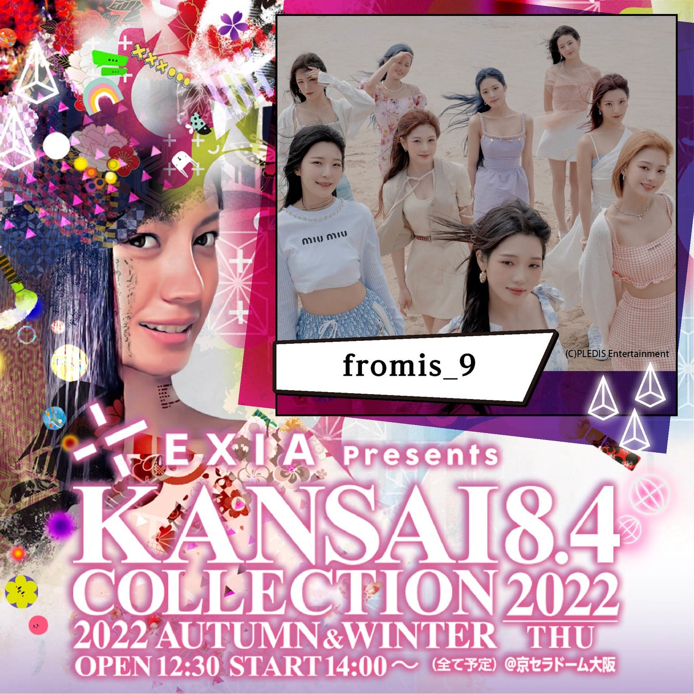 アーティストのライブ、タレントやモデルによるファッションショー、さらに会場内のブースでヘアメイクなどの体験や出演者のトークショーなどが楽しめる日本最大級のファッションイベント関西コレクション。「EXIA Presents KANSAI COLLECTION 2022 AUTUMN & WINTER」は、安斉星来、川口ゆりな、鈴木愛理、なえなの、ミチ、山之内すず、吉田朱里など人気モデルや、景井ひな、きりたんぽ、中町兄妹、ばんばんざい、ヘラヘラ三銃士など若手の支持を集めるクリエイターも続々出演が予定されている中、関西コレクション初登場のfromis_9は、Creepy Nutsや加藤ミリヤなどと並んでLIVE ACTとして登場します。
