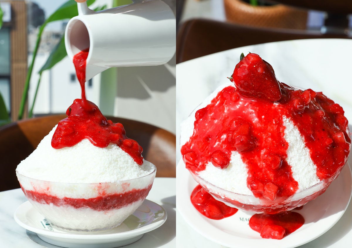 牛乳のミルキーなかき氷にいちごの果肉が入ったシロップをかけた絶妙なバランスのビンス。真っ白な氷はミルクかき氷を使って氷だけでも甘くて美味しいです。その上にイチゴシロップがたっぷり。