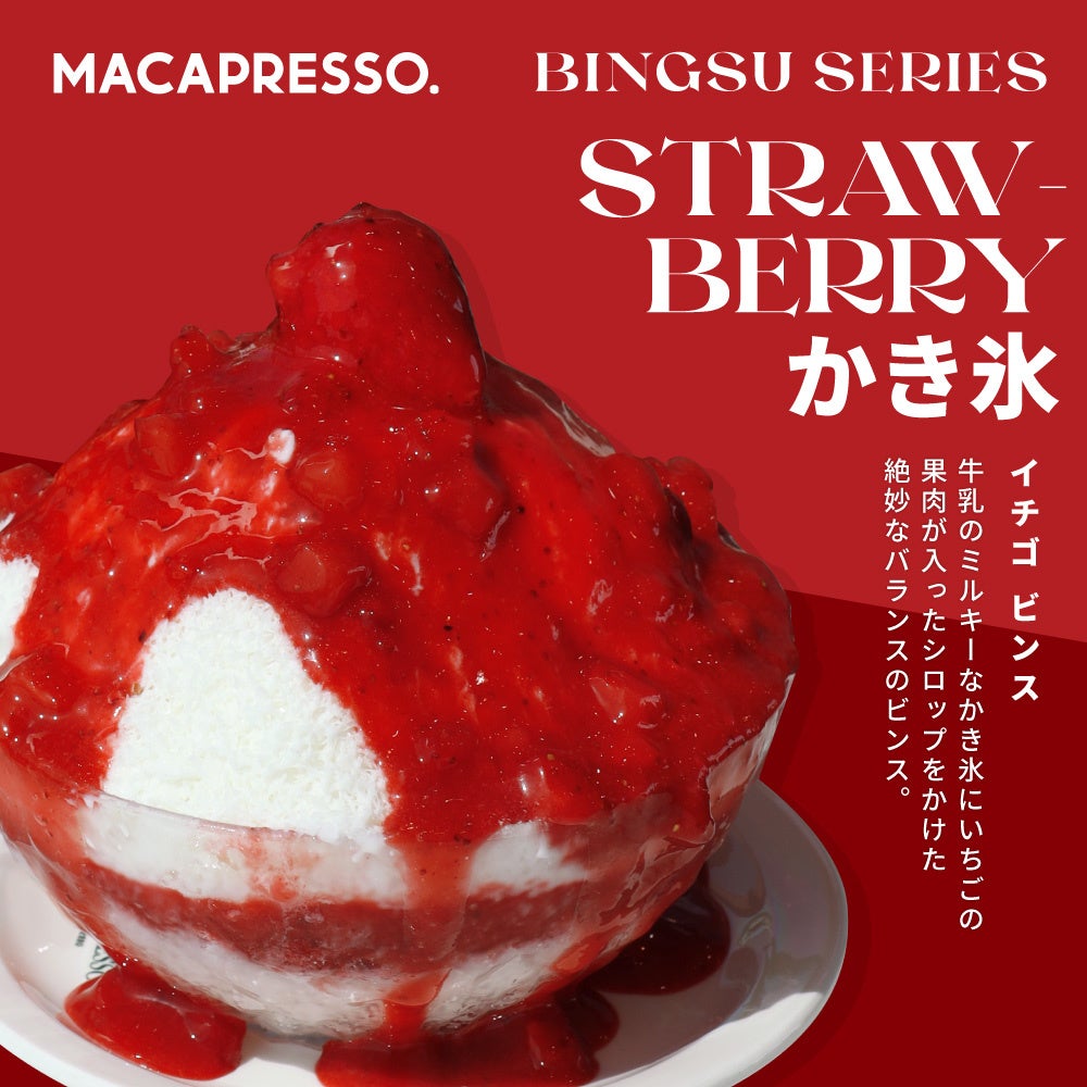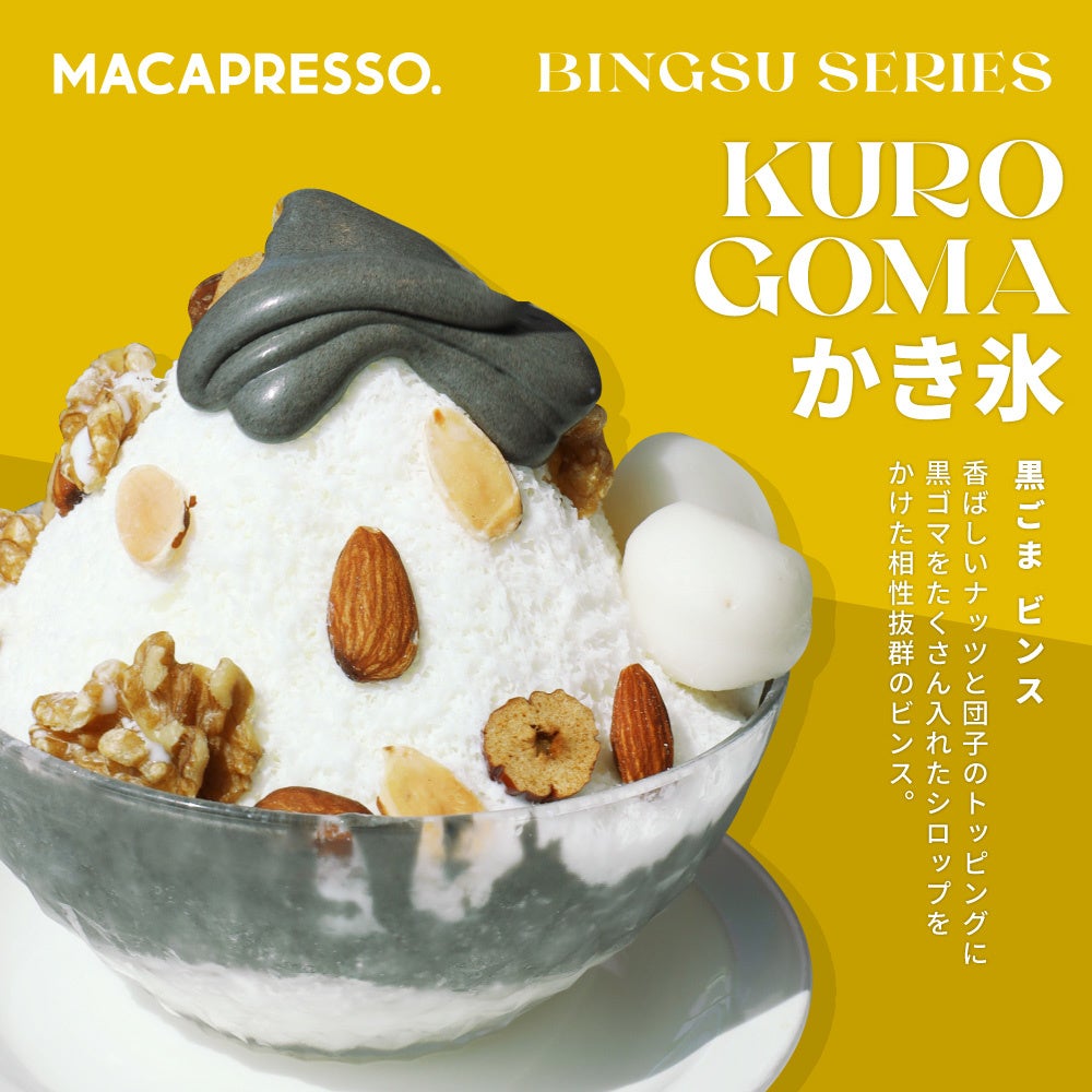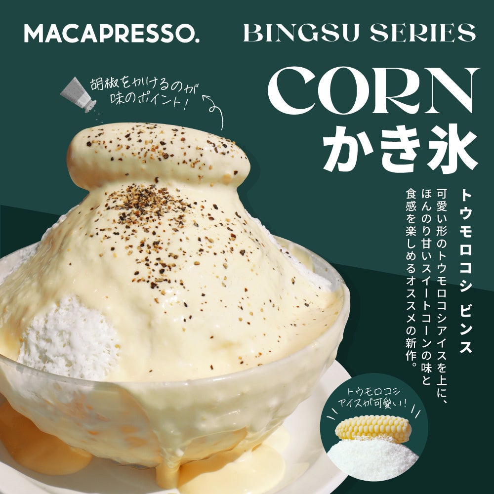 MACAPRESSOは5月中旬頃本店(新大久保)含め各店舗(銀座SIX店、天王子MIO店、川越店、大阪店(鶴橋)、神戸店、京都店)で三つの味(トウモロコシビンス、イチゴビンス、黒ごまビンス)を夏限定として展開しております。