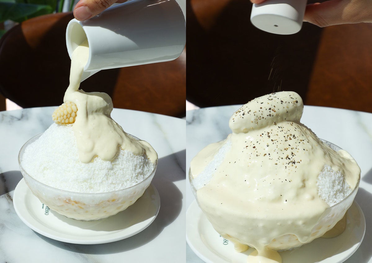 可愛い形のトウモロコシアイスを上に乗せた、ほんのり甘いスイートコーンの味と食感を楽しめるオススメの新作。氷の中にとうもろこしの粒が入っているので氷だけでも甘い。その上に、バニラクリームととうもろこしの運命の出会い。仕上げはコショウをかけてあましょぱいビンスの完成です。