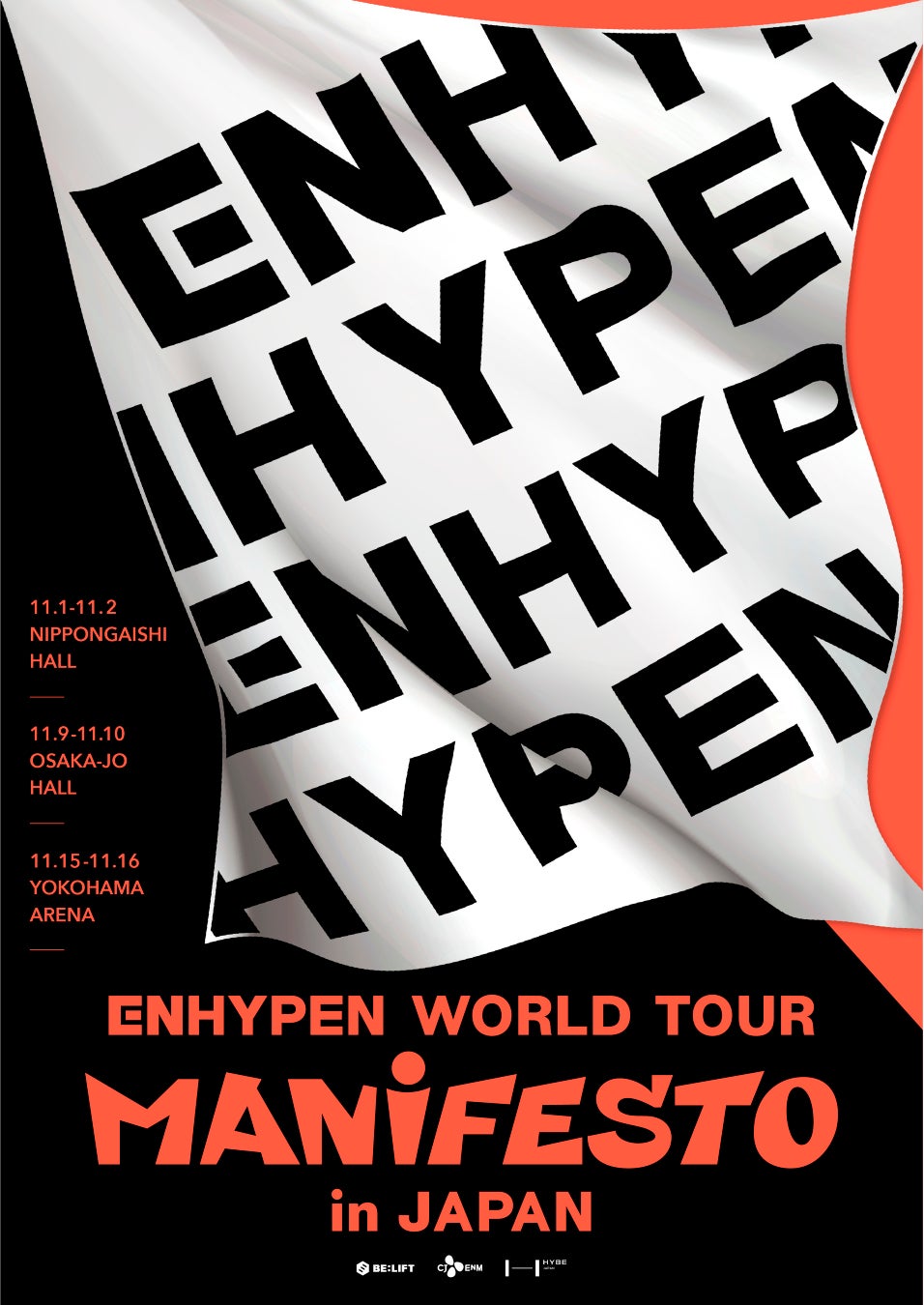 『ENHYPEN WORLD TOUR 'MANIFESTO'』は、9月17・18日のソウル公演を皮切りに、アナハイム(10月2日)、フォートワース(6日)、ヒューストン(8日)、アトランタ(11日)、シカゴ(13日)、ニューヨーク(15日)など北米の6都市6公演を実施後、日本において愛知・日本ガイシホール(11月1・2日)、大阪・大阪城ホール(9・10日)、神奈川・横浜アリーナ(15・16日)の6公演を実施します。