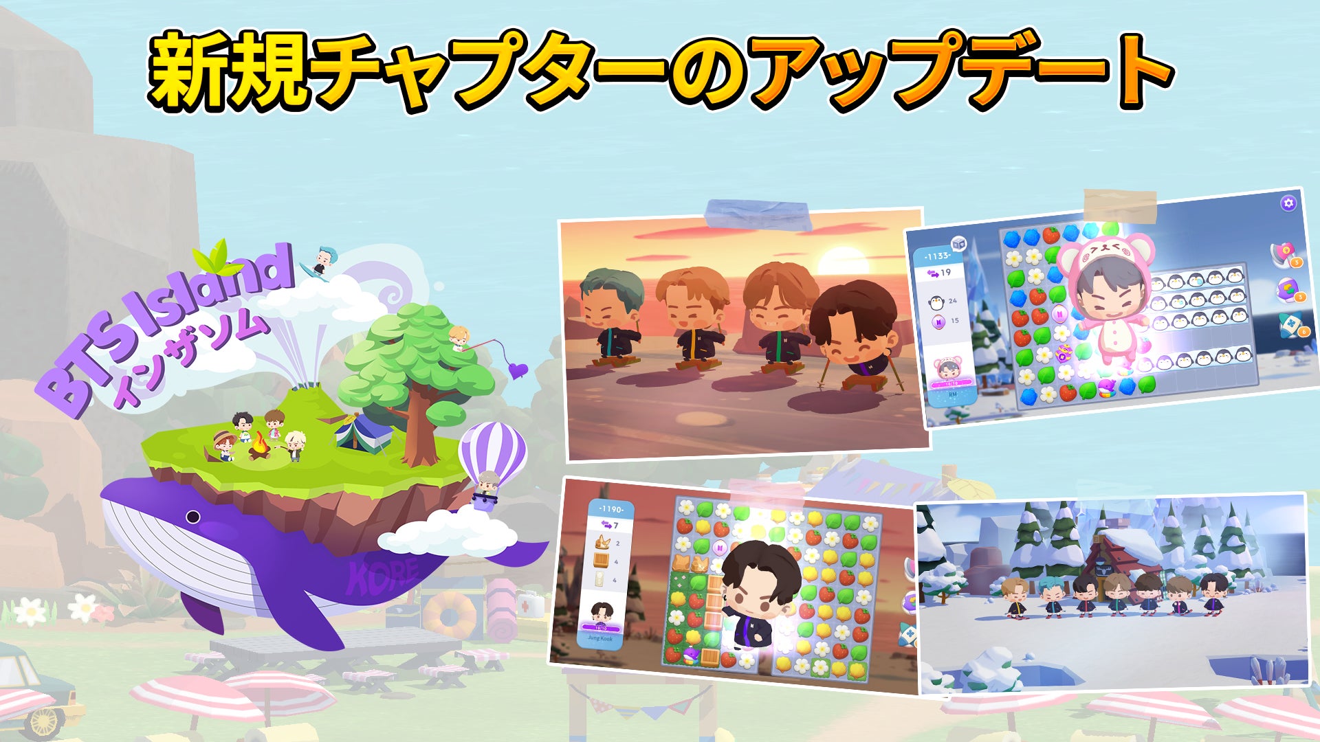 新しいパズルとギミックが追加され、さらに強化したプレイ体験を提供している。今回のバージョンではパズルレベル1,130まで開放されており、最高1,280レベルまで順次拡張予定です。パズルを同時に壊したら起きるペンギンの群れおよび茂みの下に隠された石版は既にお楽しみ頂くことができ、今後のパズルアップデートでは最大ターンの数を増やすドラムが追加されます。合計3種類の新しいギミックが追加され、パズルプレイの面白さを高めた。ここに、BTSの「Permission to Dance」衣装およびSUGAの「Daechwita」パッケージ、動物パジャマシリーズなど新規キャラクター衣装も追加され、より個性あふれる自分だけのキャラクターと島を飾ることができる。