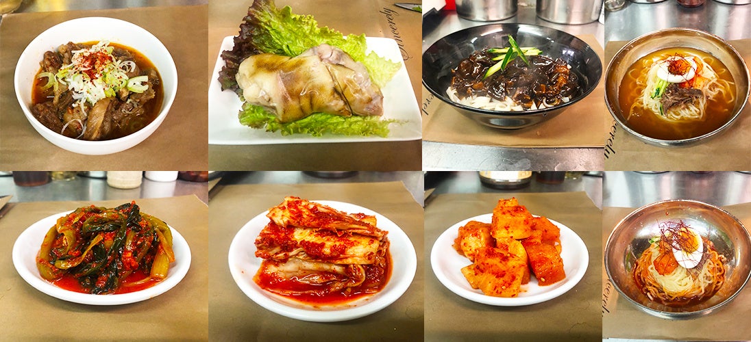 大きく印刷されたミニブタの"テグン店長"が目を引くデザインのボードステーションでは、袋入りの自家製冷麺、ピビン麺、牛すじ煮込みや瓶詰キムチなど人気商品の購入が可能です。