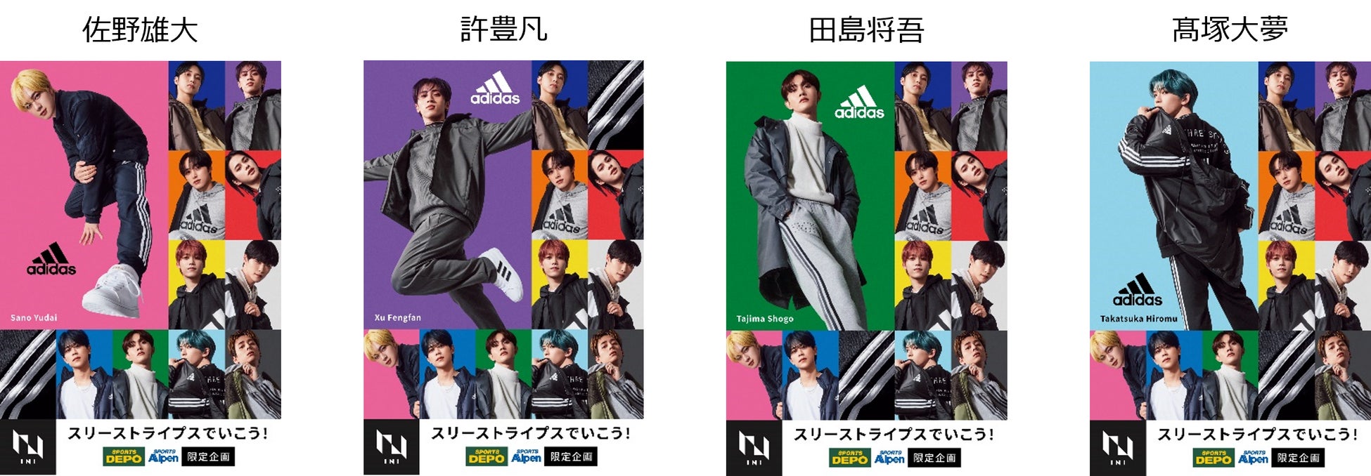 また、本キャンペーンでは、アディダスの商品を5,000円(税込)以上購入するごと(公式オンラインストアでは5,000円(税込)以上のアディダス商品1点購入するごと)に、グローバルボーイズグループ・INI(アイエヌアイ)のオリジナルステッカーをプレゼントします。ステッカーは全11種類で、様々なシーンにおけるアディダス商品を発信してきたINIメンバーそれぞれが、スリーストライプスを纏い、アクティブライフを表現しています。