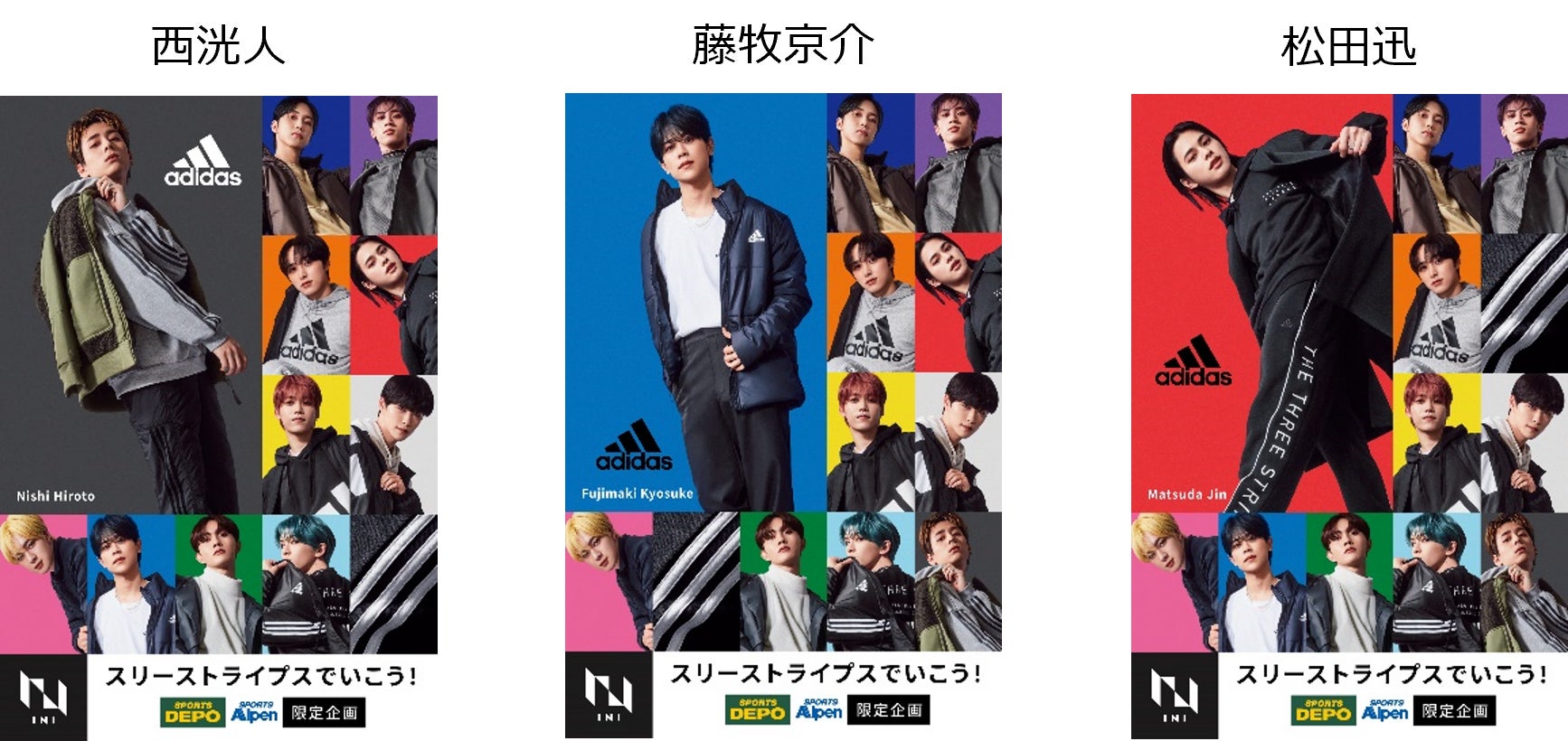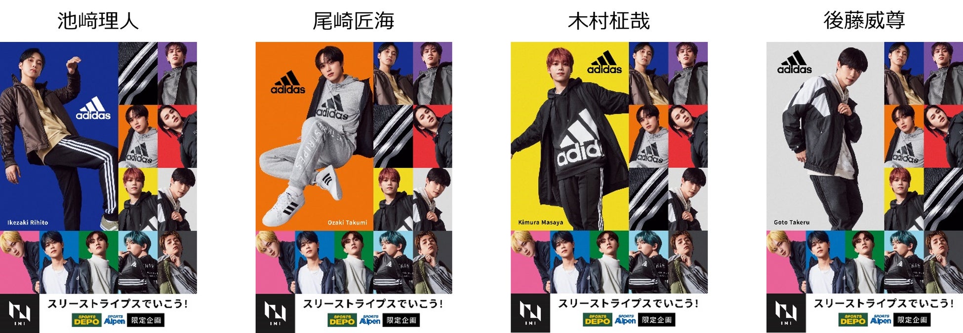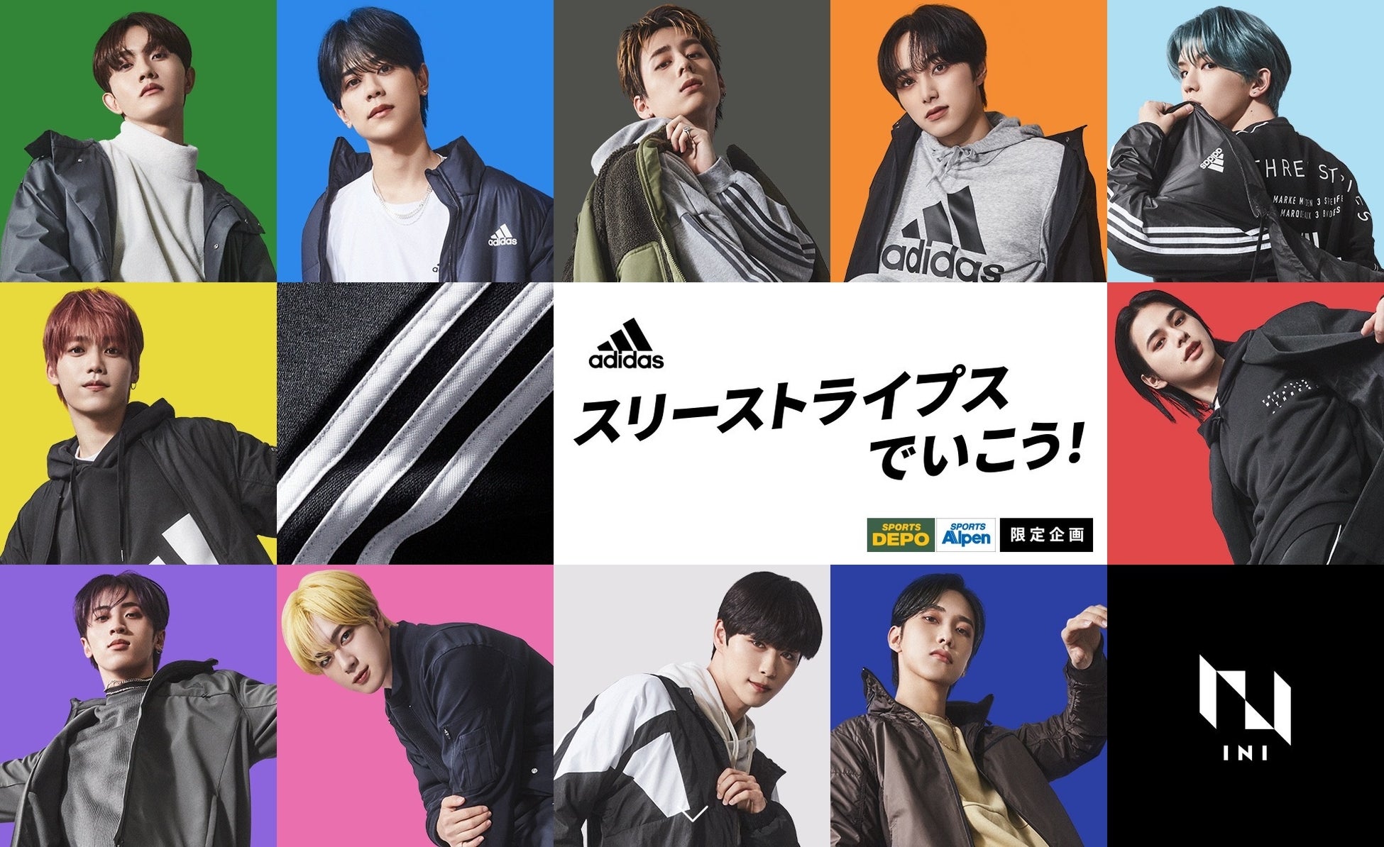 アディダスの象徴として掲げられている「スリーストライプス」を使用した商品の数々や、INIメンバーのコーディネートを公開。さらに、アルペン店員が勧めるアクティブなライフスタイルにマッチするアディダス商品のコーディネートを紹介しています。