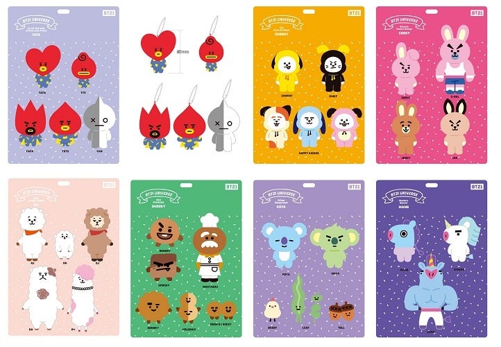 BT21各キャラクターのファミリーやライバル、友だちなど、ユニバースのキャラクターが集合した、豪華でレアなマスコットセットが登場!