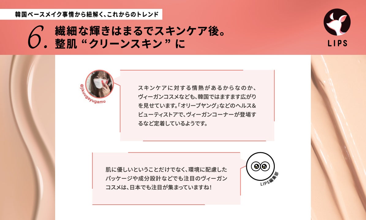 今後日本でも広がりを見せるのであれば、そういったヴィーガンコスメなどを使用した、肌にも環境にも優しい"クリーンスキン"がトレンドに上がるかも!?