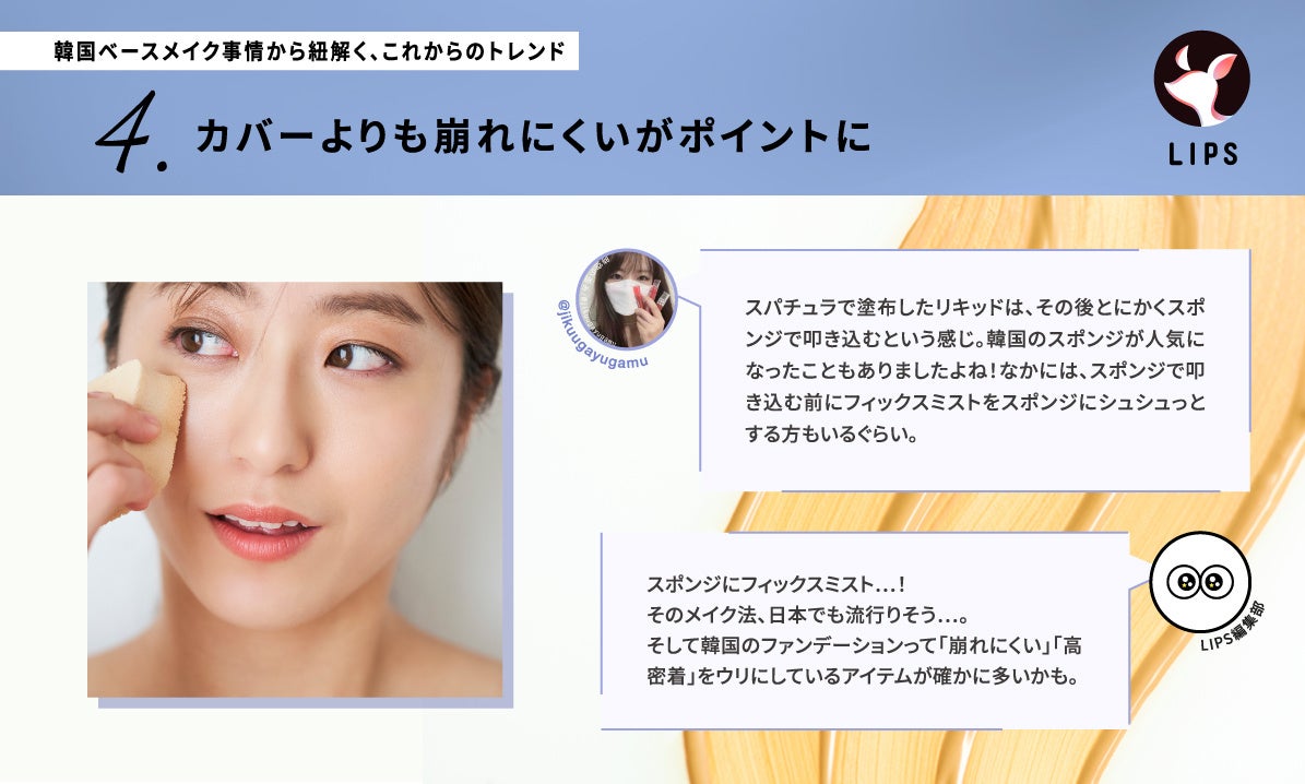 「その後はとにかくスポンジで叩き込みます。スポンジにフィックスミストをシュシュっとして使う方もいるぐらい」(時空の歪み 韓国コスメオタクさん)