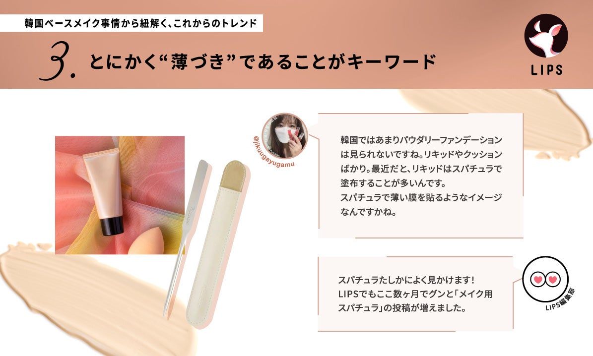 LIPSで人気のファンデーションを見ても、韓国ブランドはたしかにクッションファンデが上位に連なります(さすがクッションファンデの産みの親!)また昨今では、リキッドファンデーションをメイク用スパチュラを使用して塗布することが多いんだとか。