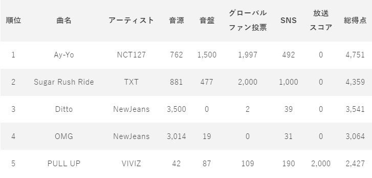 (※)各スコアの割合音源35%、音盤15%、グローバルファン投票(アプリ)20%、SNS10%、放送スコア20%