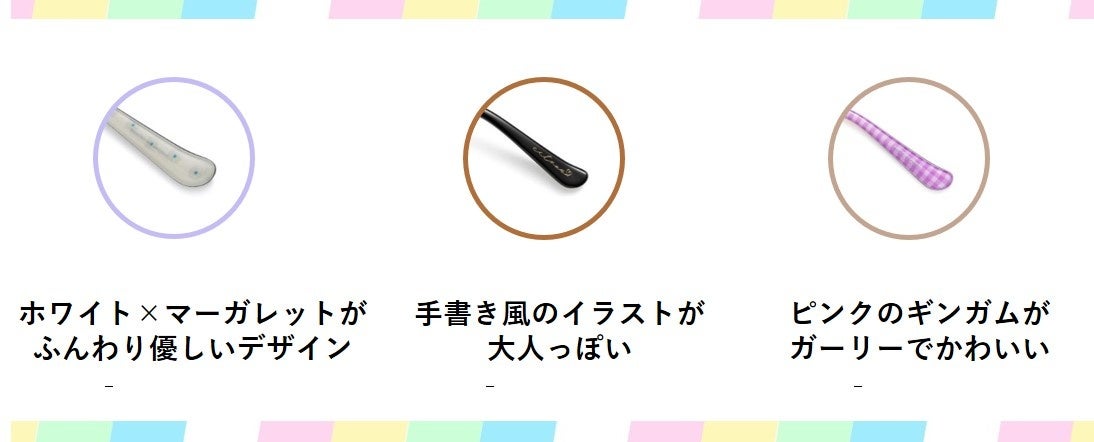 オトナっぽくガーリーな印象を与える天地広めで少し角を持たせたオーバルシェイプ。モダンの先端にアクセントとなるポイントカラーとポップなイラストを取り入れたかわいいデザインです。カラーは、ミルキーブラウン、ピンクベージュ、ゴールドの3色です。