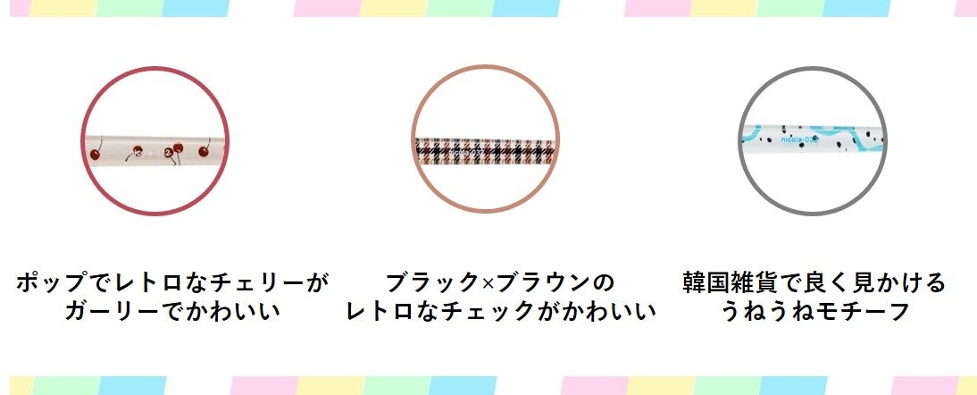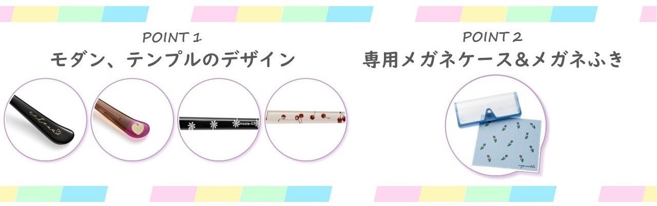 コラボ第8弾となる今回もニコラ専属モデルのニコ㋲と打合せを重ね、制服に似合うよう外側はシンプルなデザインにし、フレームの内側などには韓国インテリアで人気の手書き風イラストや英字、ポップなイラスト等SNSのトレンドを取り入れオトナっぽくてかわいいメガネに仕上げました。また、可愛い形や色合いが韓国インテリアのアクセントになることでSNSを中心に人気が高まっているチューリップをメガネふきのデザインに取り入れるなど、細部までニコ㋲のこだわりが詰まった新作です。