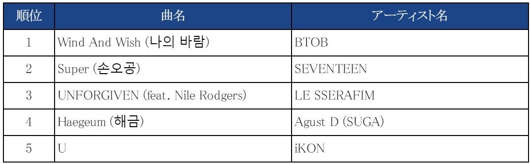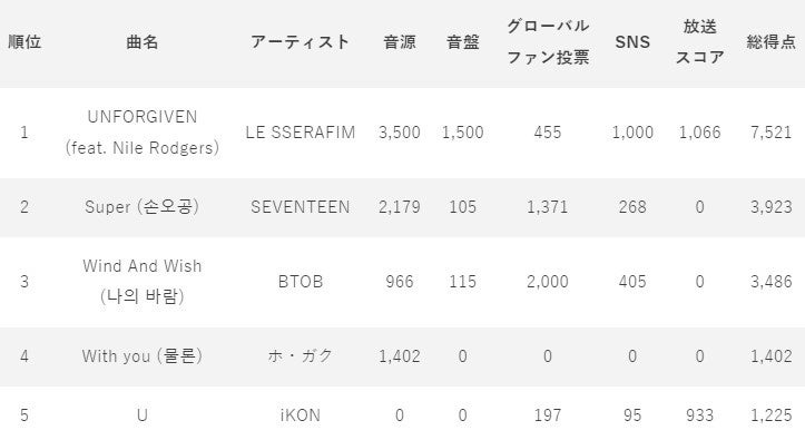 | ■5月10日(水)の放送回でLE SSERAFIMのUNFORGIVEN (feat. Nile Rodgers)が総得点で 1位を獲得しました! |