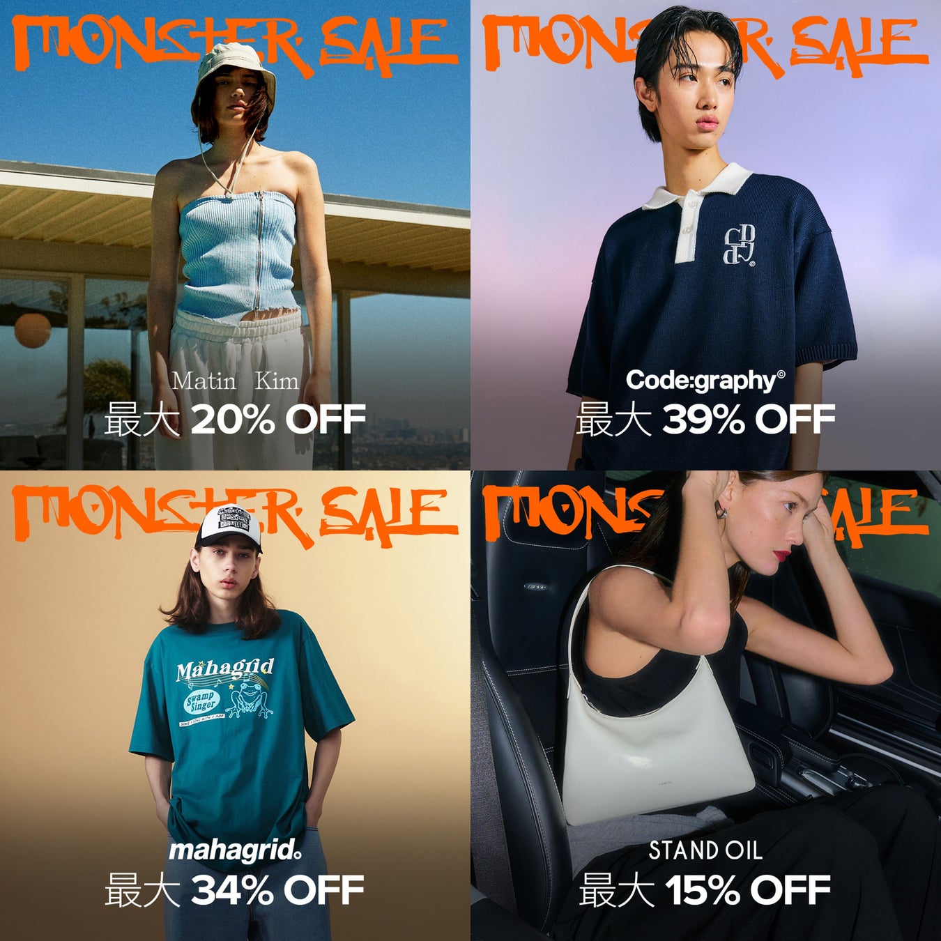 GLOBAL STOREにて開催される「無尽蔵 SALE / MONSTER SALE」には、人気ブランドが多数参加。 韓国のMUSINSAで毎年夏に開催されてきた本セールが、ついにGLOBAL STOREで開催されることを記念して、その割引率は最大90%!さらにアプリからの購入で、10%の追加割引が適用されるため、韓国ファッションブランドの購入を迷っていた人には絶好のチャンス。