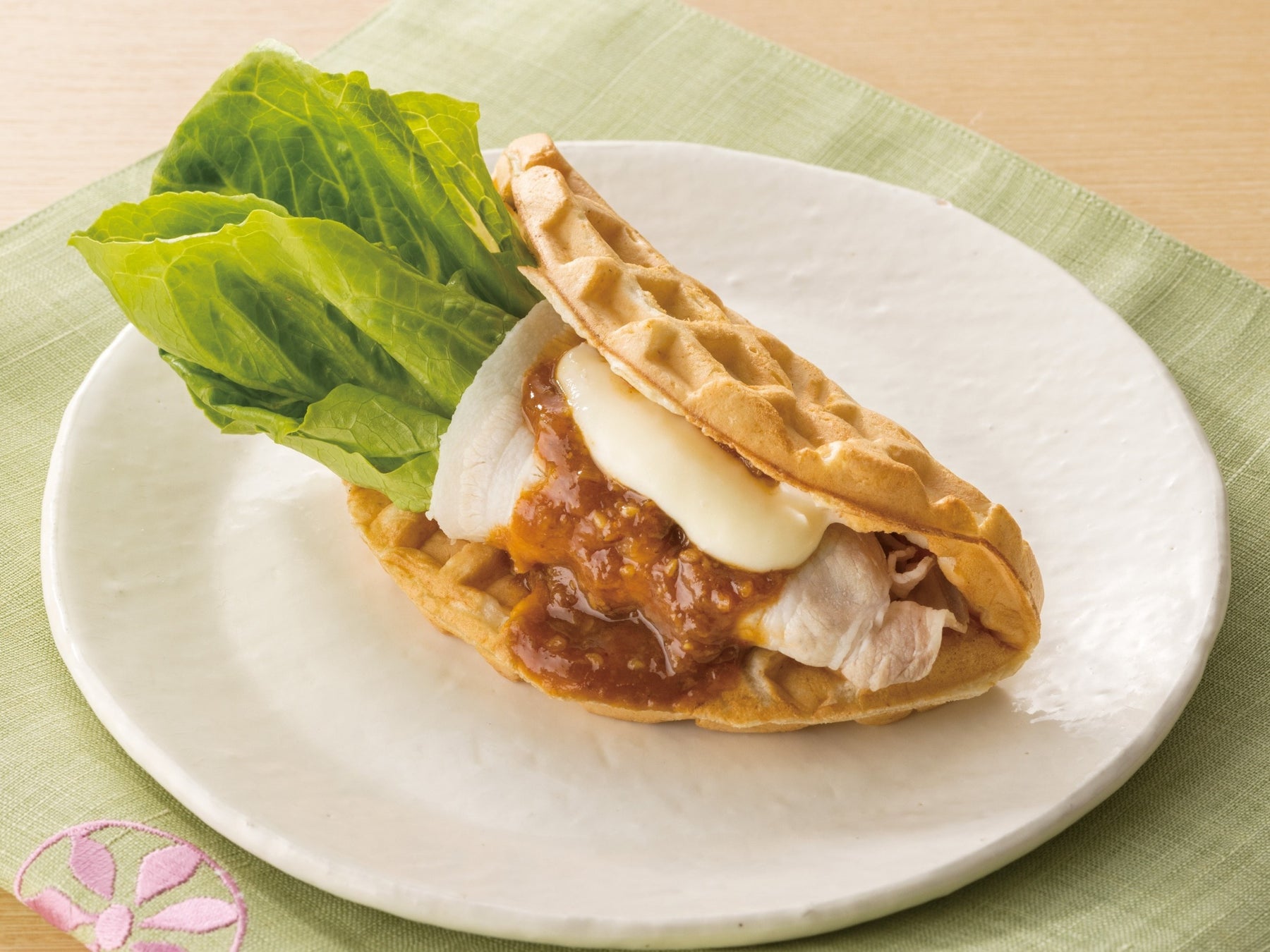 しゃぶしゃぶした豚バラにサムジャン、チーズをはさんでオリジナルワッフルが完成!