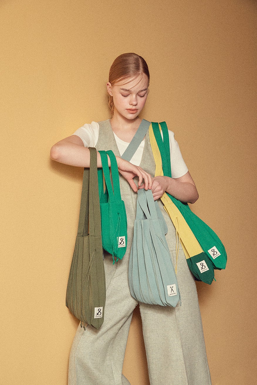 「JOSEPH AND STACEY(ジョセフアンドステイシー)」は持続可能な経営のために、原料から工程まで細心の注意を払っています。プラスチックボトルをリサイクルした環境にやさしい繊維で製作され、ニットバッグを使えば使うほど地球のプラスチックがなくなります。開発の際には素材の追求を徹底的に行い、様々なファブリックにて施策を重ね、現在の『ラッキープリーツニット』という素材が誕生いたしました。