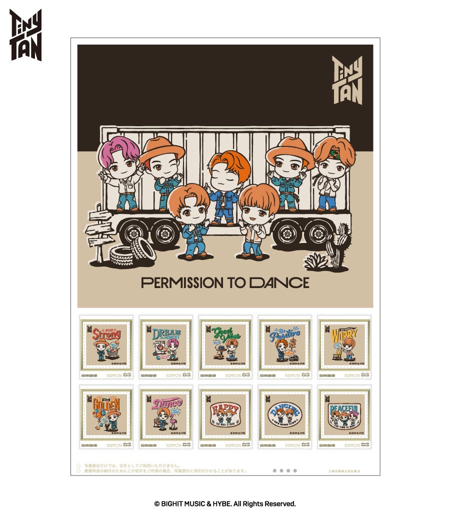 RM、Jin、SUGA、j-hope、Jimin、V、Jung Kookが、世界へ様々なメッセージを残した名曲「Permission to Dance」の世界観を表現したデザインの限定メモリアルフレーム切手は必見となります。