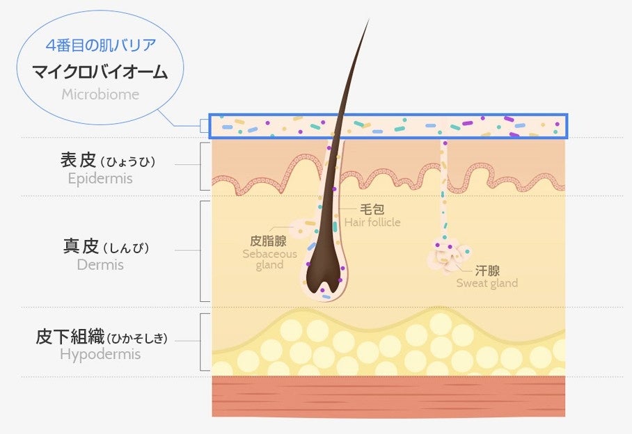 マイクロバイオームは、微生物(Microbe)と生態系(Biome)が合わさった言葉であり、土壌や植物由来・大腸由来の自然成分から構成されています。近年では、「第四の皮膚層」と呼ばれる“マイクロバイオーム層”の研究が注目されています。皮膚は①表皮層②真皮層③皮下組織④マイクロバイオーム層の計4つの皮膚層から構成されています。肌の表面のみならず、皮膚の本質的な原因をケアすることができる注目の成分として、業界で注目を集めています。