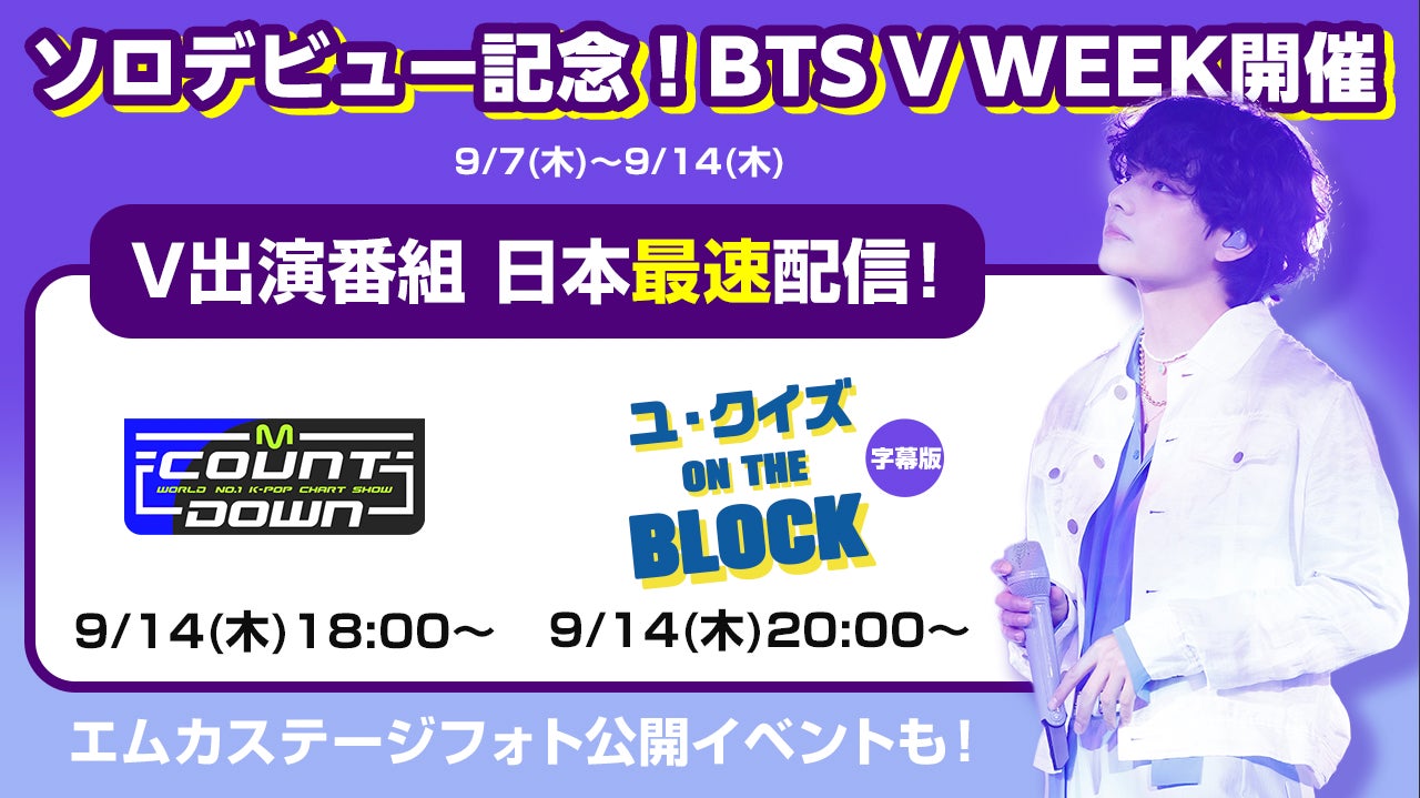 9月14日(木)に、V(BTS)がソロでゲスト出演し話題を集めたバラエティ「ユ・クイズ ON THE BLOCK」の出演パートの日本語字幕版を最速配信します。さらに、人気音楽番組「M COUNTDOWN」の出演も決まり、日韓同時配信でお届けします。