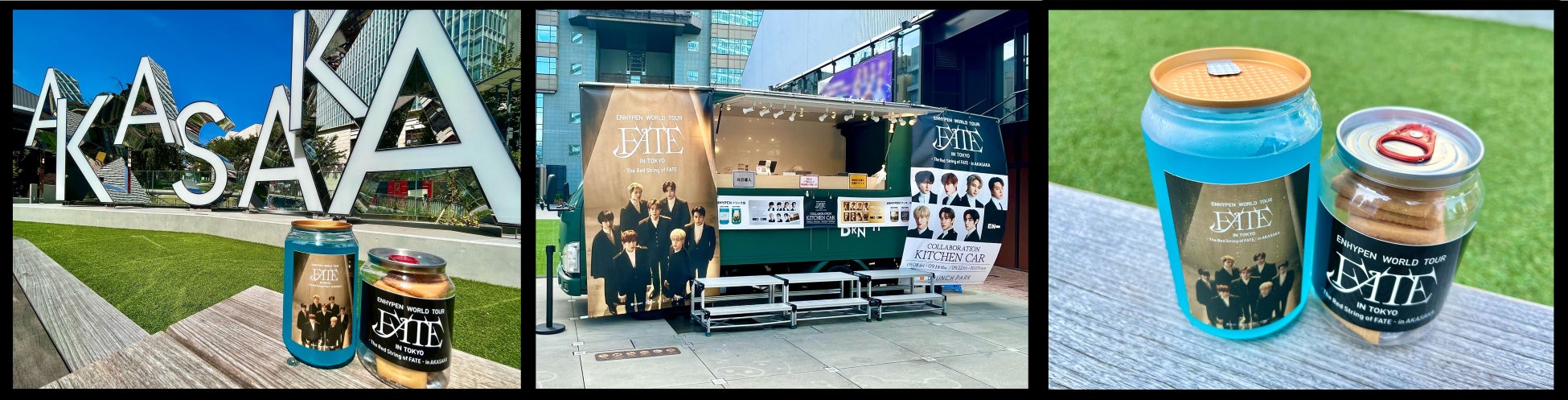 また赤坂サカスに設置されたキッチンカーでは、ここでしか手に入らないENHYPENコラボレーション商品を販売。夏らしい鮮やかなブルーのドリンク缶と、並べると”ENHYPEN”になるアルファベットのかわいらしいクッキー缶が好評を得ています。
