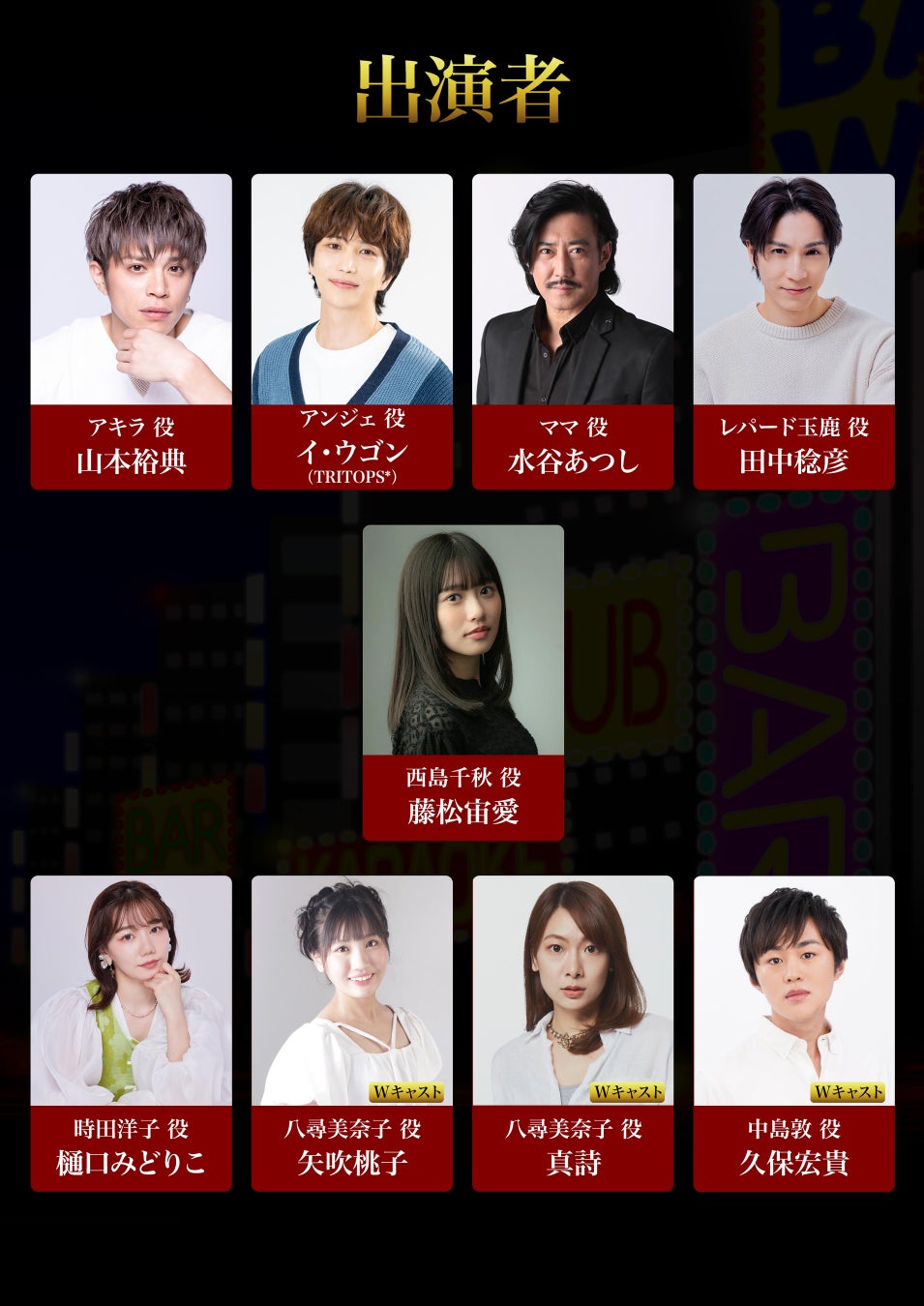 今回の集結した豪華キャストは、2005年の『ジュノン・スーパーボーイ・コンテスト』で準グランプリ&フォトジェニック賞を受賞し『仮面ライダーカブト』やドラマ『花ざかりの君たちへ~イケメン♂パラダイス~』など俳優として活躍する山本裕典。韓国出身4人組男性ボーカルグループ「TRITOPS*」のメンバーで、ずば抜けた歌唱力を持ち、近年俳優として舞台にも多数出演するイ・ウゴン。1984年東京キッドブラザースで看板俳優として全国公演で活躍しTVドラマ、映画、舞台など幅広く活動する実力派俳優の水谷あつし。舞台を中心に活動し、ストレートプレイから2.5次元舞台までジャンル問わず振り幅の大きい演技に定評がある田中稔彦が出演決定!