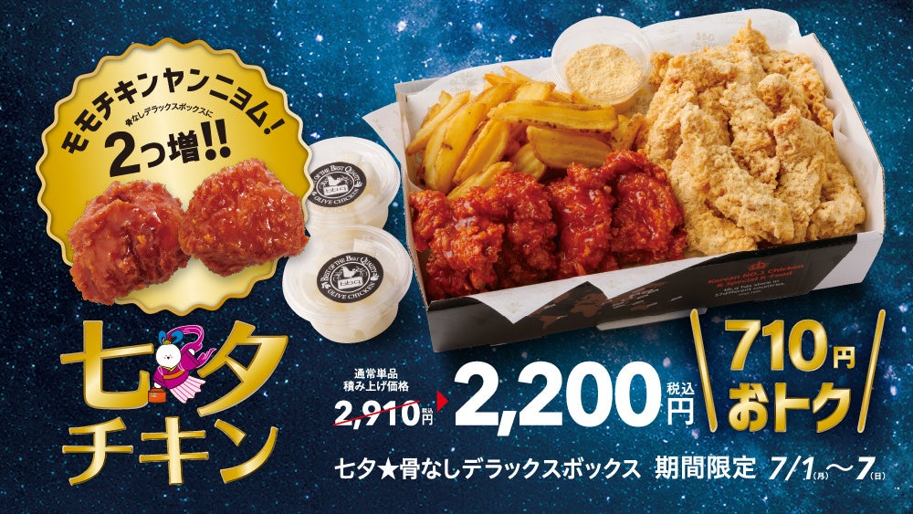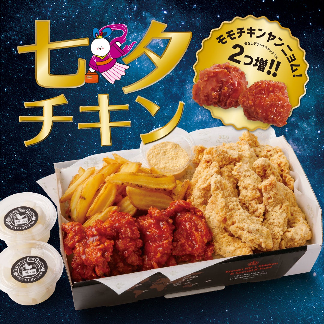 『オリーブチキンカフェ』では、大満足ボリュームの『七夕骨なしデラックスボックス』(2,200円税込)を期間限定で販売いたします。本商品は通常販売している『骨なしデラックスボックス』(2,200円税込)のお値段そのままにヤンニョムチキンを2個増量!しています。チーズリングチキンフィンガー10本(追いチーズリングパウダー付)やフライドポテトLサイズがセットになって、単品積み上げ価格2910円に対して710円オトクなチキンボックスとなっております。