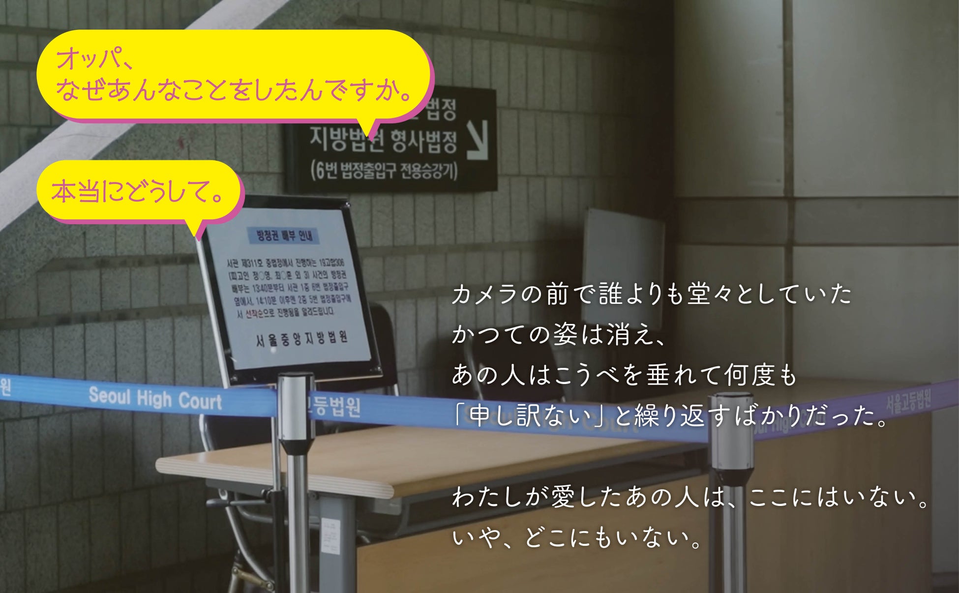 「オッパ、なぜあんなことをしたんですか。本当にどうして。わたしが知っていたオッパの姿と違うのは、なぜですか。どうして今、オッパは拘置所にいるのでしょうか。わたしはソウルの大学に進学して、映画を勉強しています。そう伝えたかったのに。なぜ、そんなところにいるのか。本当に、どうして」