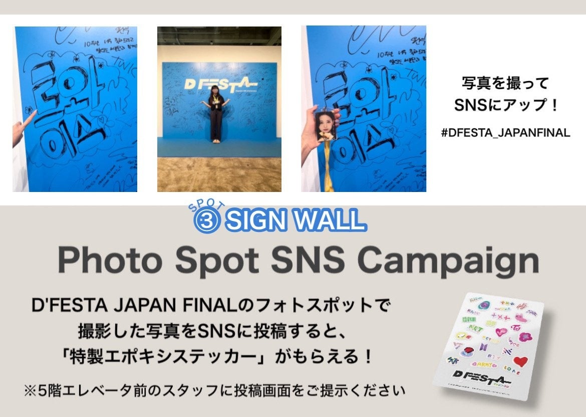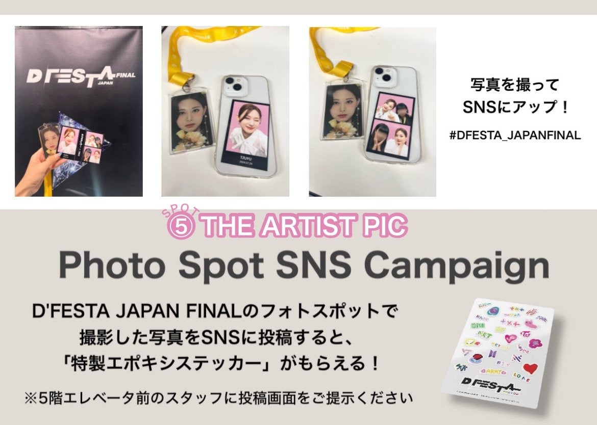 韓国芸能ニュースメディア“Dispatch(ディスパッチ)”の創立10周年を記念し開催された、ENHYPEN/TXT/Stray kids/NCT DREAM/ NCT 127/TWICE/SEVENTEEN/BTS/NU'ESTの9組=69アーティストのオリジナルコンテンツを提供するK-POPフェス「D'FESTA」。「D'FESTA JAPAN FINAL」として2024年9月1日(日)まで開催中の当イベントにて会場内のフォトスポットを撮影してSNSに投稿すると、参加アーティストメンバーが書いたイラストで制作した「特製エポキシステッカー」がもらえるスペシャルキャンペーンを開催中!
