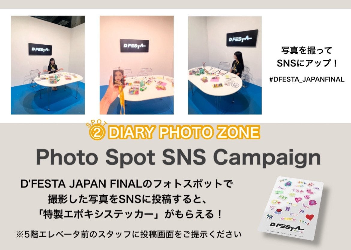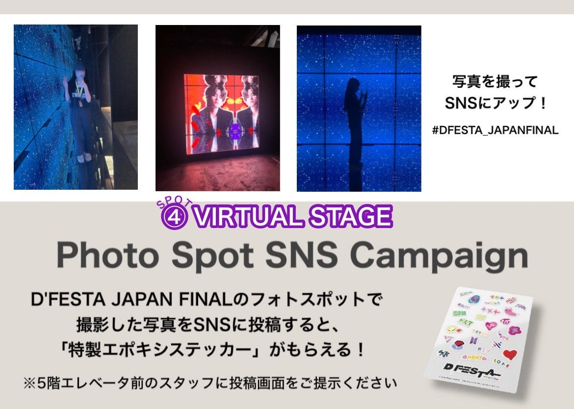 ①「D’FESTA JAPAN FINAL」会場内のフォトスポットゾーン(計5か所 下記にて紹介しています)にて撮影した写真にハッシュタグ「#DFESTA_JAPANFINAL」を付けてSNSに投稿してください。