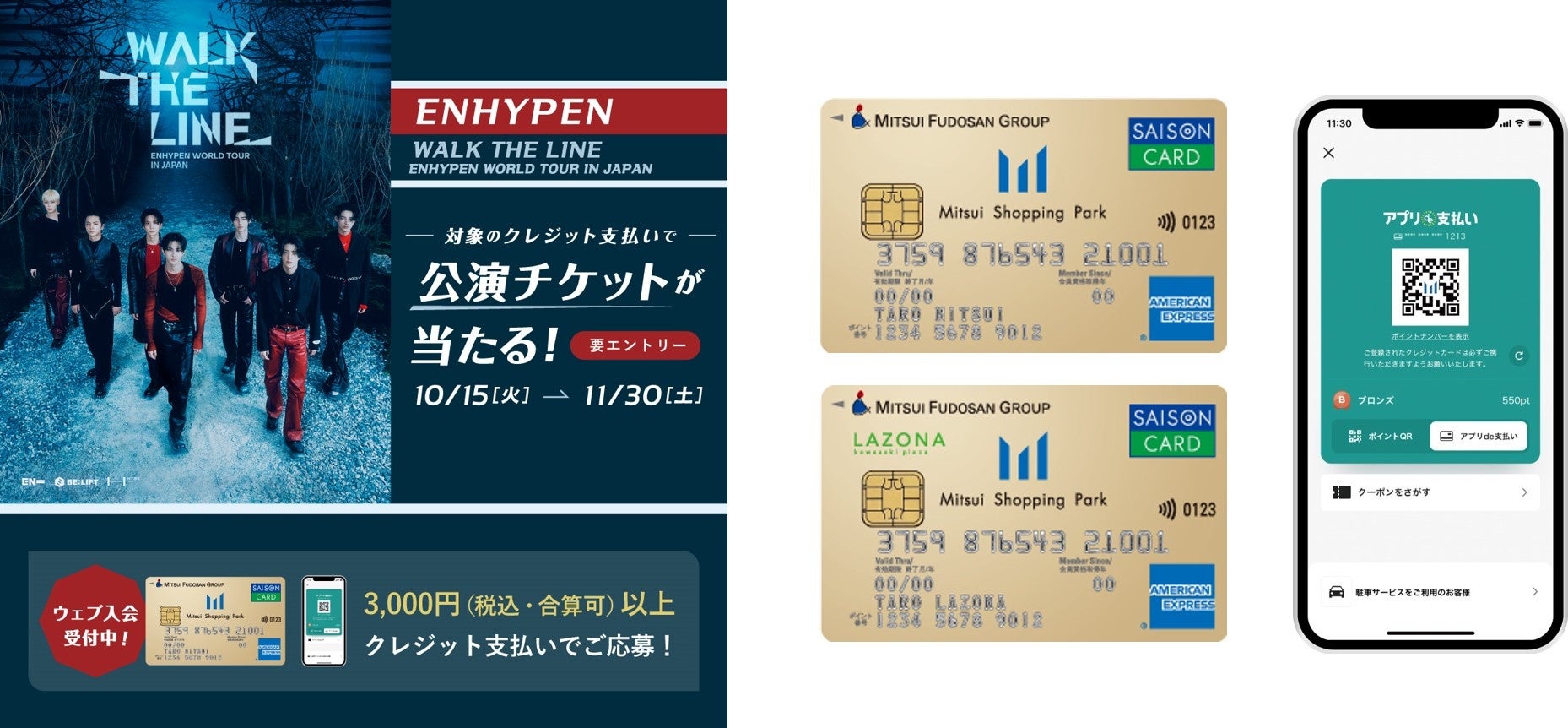 期間中、三井ショッピングパークポイントが使える全国の施設、または公式通販サイト「&mall」にて、三井ショッピングパークカード《セゾン》(アプリde支払い含む)など対象カードで3,000円以上(税込・合算可)クレジット支払いいただくことでご応募可能なキャンペーンです。ご応募いただいた方の中から抽選で20組40名様に『ENHYPEN WORLD TOUR ‘WALK THE LINE’ IN JAPAN』の公演チケットをプレゼントいたします。