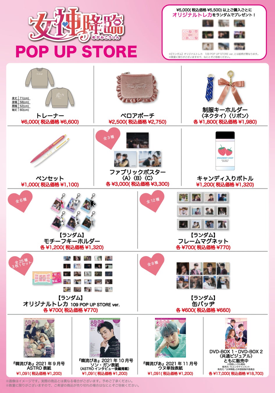韓国ボーイズグループASTROのチャウヌ(ASTRO)主演で、大ヒットWEB漫画を実写化した『⼥神降臨』。メイクで変身した❝⼥神❞を二人のイケメン男子が奪い合う!? 学園ラブコメは、韓国はもちろんアジア各国でヒットし話題を呼んでいる。そんな世界観を丸ごと再現するオフィシャルストアが、この度SHIBUYA109渋谷店・阿倍野店で期間限定オープンする︕ドラマでキーとなる教室を再現した会場に加え、ドラマのワンシーンやキーアイテムを使用したここでしか買えないオリジナルグッズがずらりと並ぶ︕ 店内映像ではDVDの特典映像を一部公開するなど、⼥神降臨ワールドにどっぷり浸れること必⾄。レアな購入特典にも注目だ。また、⼥神降臨DVDBOXや、チャウヌおよびASTRO掲載の韓流ぴあの販売もある。是非、この機会にドラマの世界をリアルに感じてみては。