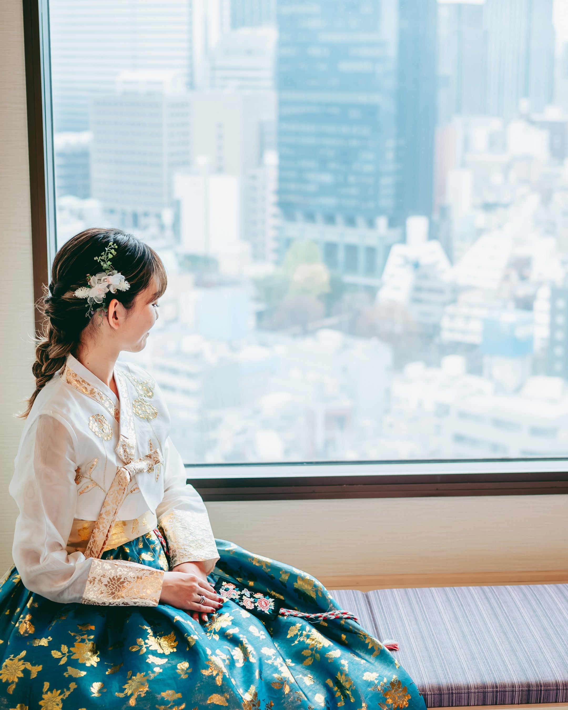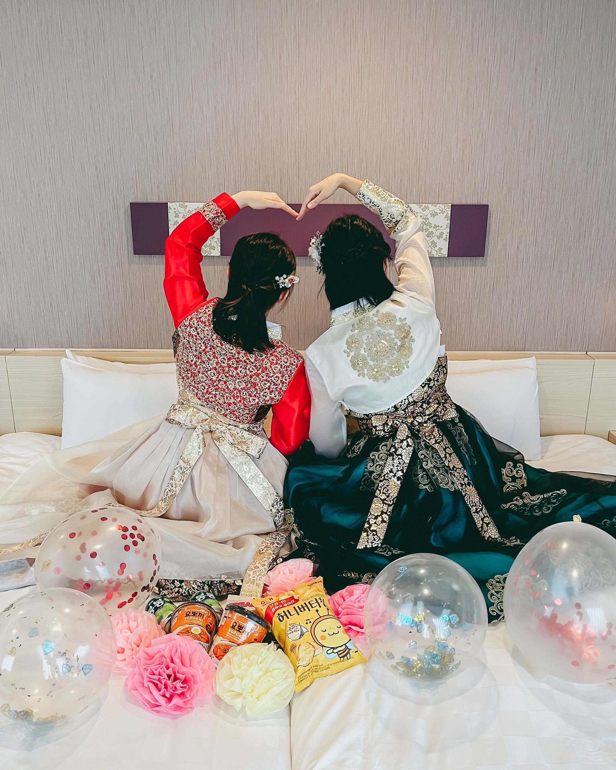 4:00P.M. ホテルに戻り、チマチョゴリの着付けスタート。プランにセットの韓国トレンドのチューリップ造花や、新大久保で購入したお菓子等と一緒に「#韓国っぽ」な写真撮影。