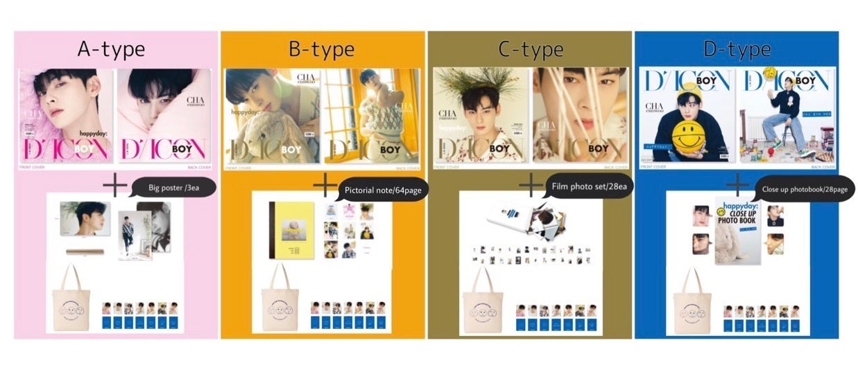 「Dicon BOY ISSUE N゜1 チャ・ウヌ写真集『happyday:』」はカバーが違う「A-type」「B-type」「C-type」「D-type」の全4タイプで、それぞれ豪華付録3点(タイプによって一部特典が異なります)がついてきます。少年のようにはしゃぐ姿やセクシーな表情など、チャ・ウヌの魅力をあますところなく表現した完全撮りおろし・228ページの大ボリュームの写真集は、タイプごとに雰囲気が異なるカバーになっている点も必見です。