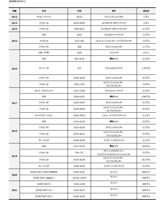 2012年にアメリカのカリフォルニアで始まったKCONは、北米、中東、ヨーロッパなど世界9都市で110万人以上の観客を集め、K-カルチャーのデジタル化を牽引する役割を果たしてきました。初年度に1万人からスタートし、直近最後の対面公演だった2019年には29万1千人余りの観客を記録するなど、実に29倍の成長を記録し、名実共にグローバルK-カルチャーフェスティバルとなりました。パンデミックにより対面公演が容易でなかった2020年からは「KCON:TACT」を通じてデジタルプラットフォームで世界中のK-カルチャーファンに会い、時間と場所にかかわらずK-カルチャーを楽しめるようにしユーザーに新しい経験を提供するとともに、非接触型フェスティバルへとさらに進化を遂げたという評価を受けました。