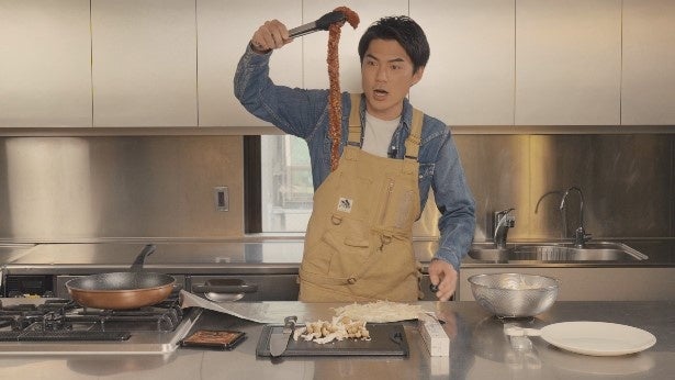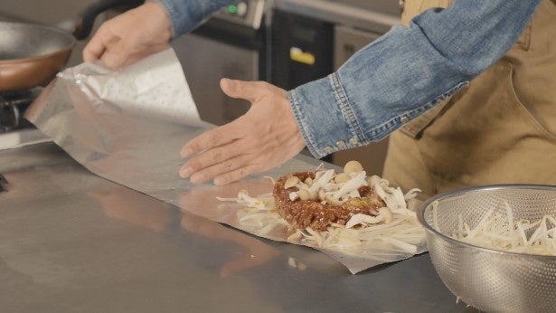 「モランボン本店監修 ハンパンハラミ」ともやし、しめじをアルミホイルで包んでフライパンで蒸し焼きにすることで、お肉を柔らかく仕上げ、お肉の旨味たっぷりの野菜も楽しめる“封筒包みテクニック”を紹介しました。商品を試食し「めちゃくちゃ美味い!」と肉とタレの美味しさに感動していました。