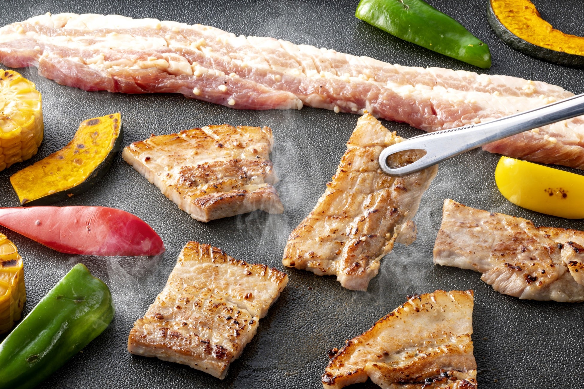 こだわりのヤンニョムであるおろしニンニクと粒感のあるニンニクを使用し、黒胡椒で味を引き締めたごま油香る塩ベースのタレで、厚切りの豚バラ肉に味付けしました。包み野菜やキムチと一緒に食べていただくことで、さらに美味しく召し上がっていただけます。