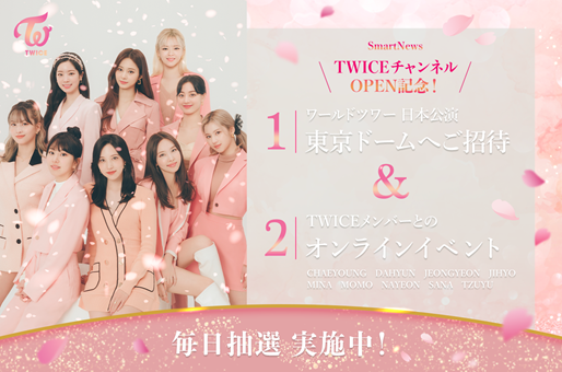 「TWICEチャンネル」では、TWICEに関連する公式情報や最新ニュースを集約してお届けします。また、スマートニュースでは、TWICEチャンネルOPEN記念として特別企画を実施。4度目のワールドツアー「TWICE 4TH WORLD TOUR 'III' IN JAPAN」の日本公演となる東京ドームチケットの毎日プレゼントや、TWICEメンバーとビデオ通話でつながりプレミアムな時間を共有できるオンラインミート&グリート券など、SmartNews限定の豪華企画をご用意しています。期間中毎日抽選に参加できる限定企画を楽しみながら、公式情報や最新のTWICEニュースをチェックできます。