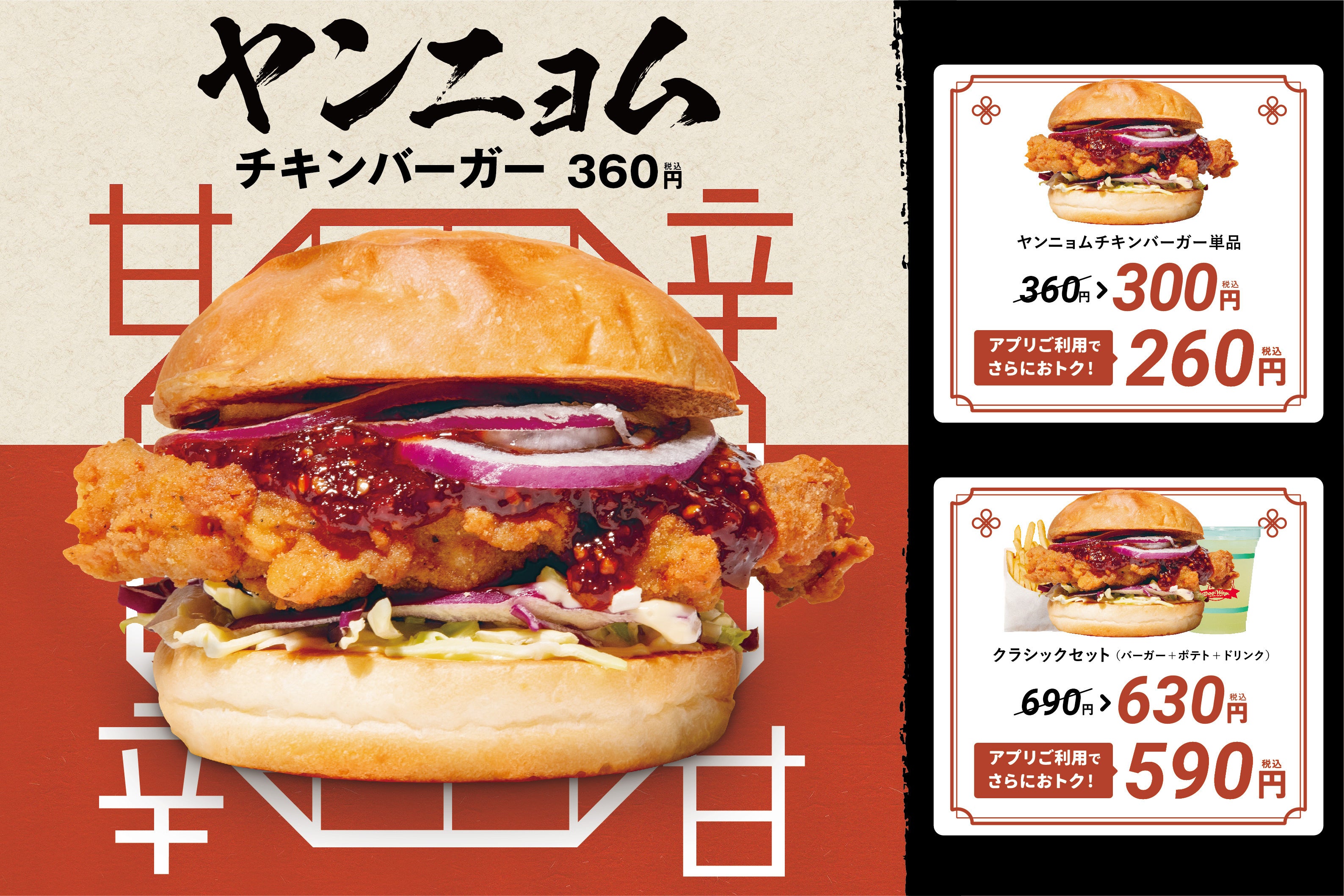 新作の「ヤンニョムチキンバーガー」をオーダーアプリ(テイクアウト)からご注文でさらにお得に!