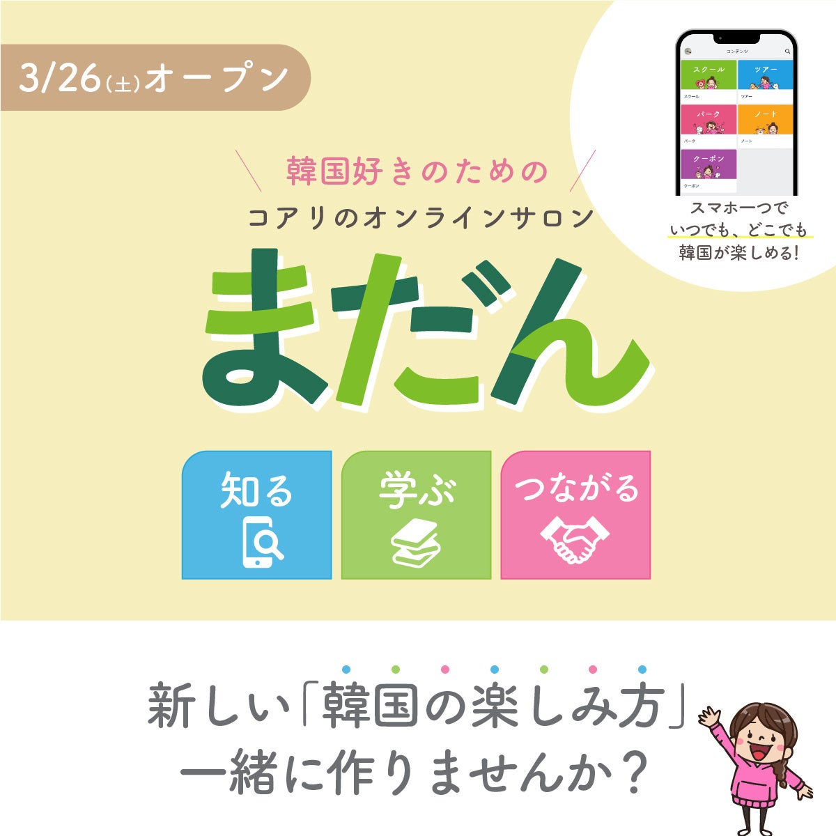 韓国への”スキ”を思う存分共有できる庭のような場所、『コアリのまだん』は明日3月26日(金)14時オープン!なお、本日3月25日(金)中に事前登録をするとハングルデザインの”学びノート”をプレゼント!この機会に是非チェックしてみてほしい。