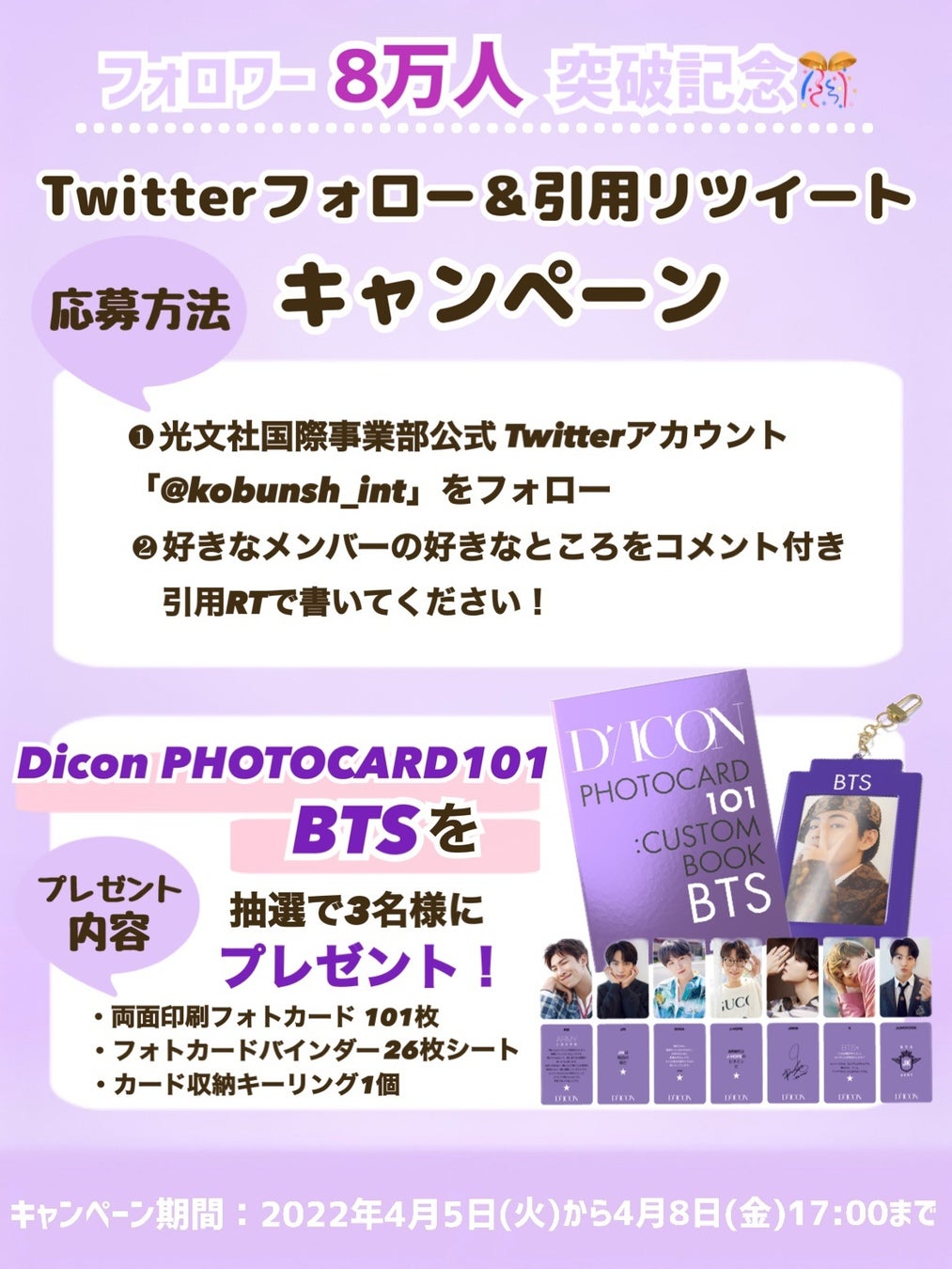 光文社国際事業部Twitterで、8万フォロワー突破記念として3週連続BTS、SEVENTEEN、NCT127のフォトカードセットが当たるプレゼントキャンペーンを実施しています。第3弾は世界的な人気グループのBTSです。4月5日(火)13:00から4月8日(金)17:00までの間に光文社国際事業部の公式Twitterをフォロー&引用RT(引用リツイート)された方の中から、抽選で3名様に「Dicon PHOTOCARD101 BTS」をプレゼントいたします。