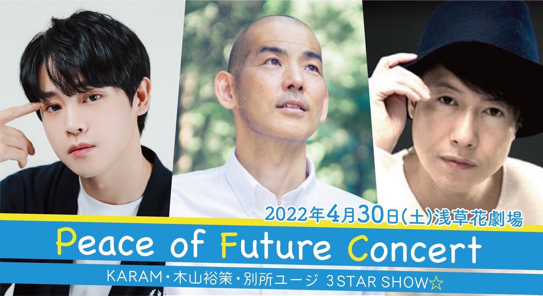来る4月30日(土)浅草花劇場にて、カラム、木山裕策、別所ユージ(Bluem of Youth) によるSpecialなコンサート【Peace of Future Concert ~3STAR SHOW~】の開催が決定!